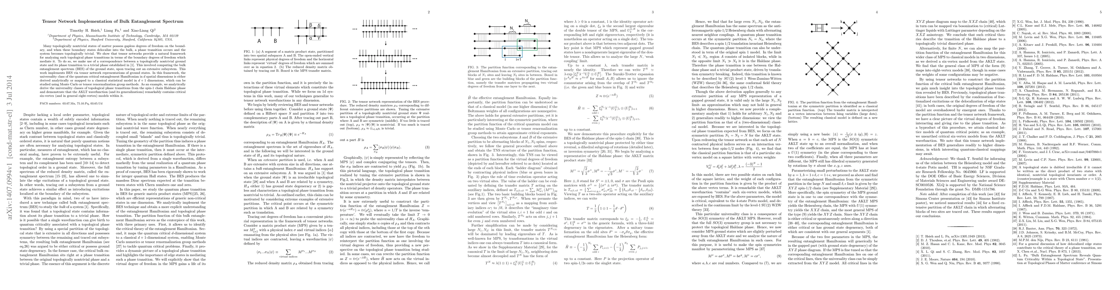 Many topologically nontrivial states of matter possess gapless degrees of freedom on the boundary, and when these boundary states delocalize into the bulk, a phase transition occurs and the system becomes topologically trivial. We show that tensor networks provide a natural framework for analyzing such topological phase transitions in terms of the boundary degrees of freedom which mediate it. To do so, we make use of a correspondence between a topologically nontrivial ground state and its phase transition to a trivial phase established in [1]. This involved computing the bulk entanglement spectrum (BES) of the ground state, upon tracing out an extensive subsystem. This work implements BES via tensor network representations of ground states. In this framework, the universality class of the quantum critical entanglement Hamiltonian in d spatial dimensions is either derived analytically or mapped to a classical statistical model in d + 1 dimensions, which can be studied using Monte Carlo or tensor renormalization group methods. As an example, we analytically derive the universality classes of topological phase transitions from the spin-1 chain Haldane phase and demonstrate that the AKLT wavefunction (and its generalizations) remarkably contains critical six-vertex (and in general eight-vertex) models within it.