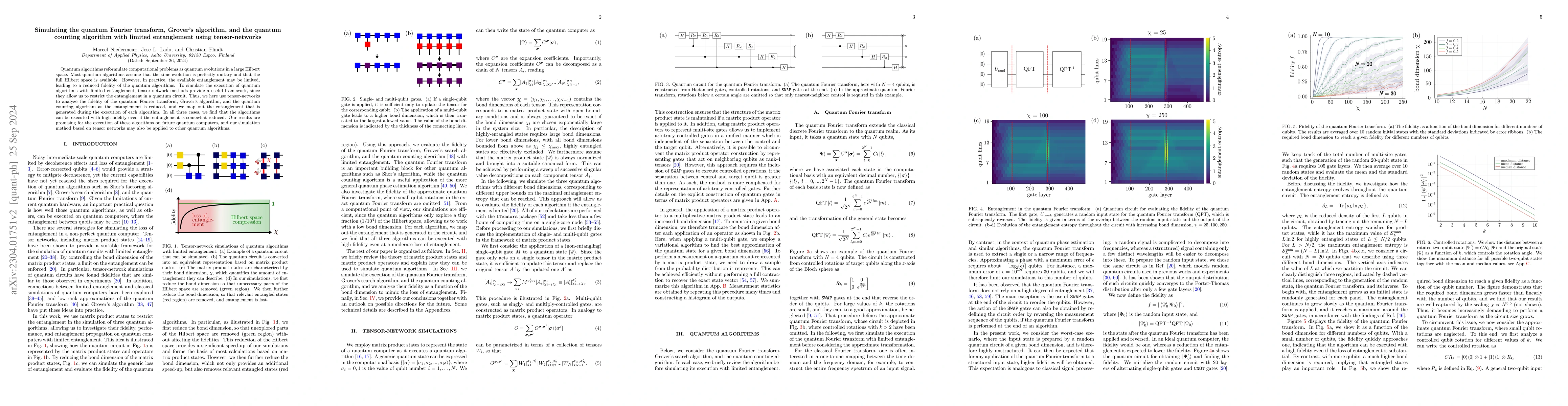 This paper uses tensor-network simulations to study the execution of three quantum algorithms on noisy quantum computers, finding that high fidelity can be maintained despite moderate entanglement loss. The approach provides a general method for simulating noisy quantum computations and reveals specific fidelity dependencies on the number of qubits for each algorithm.