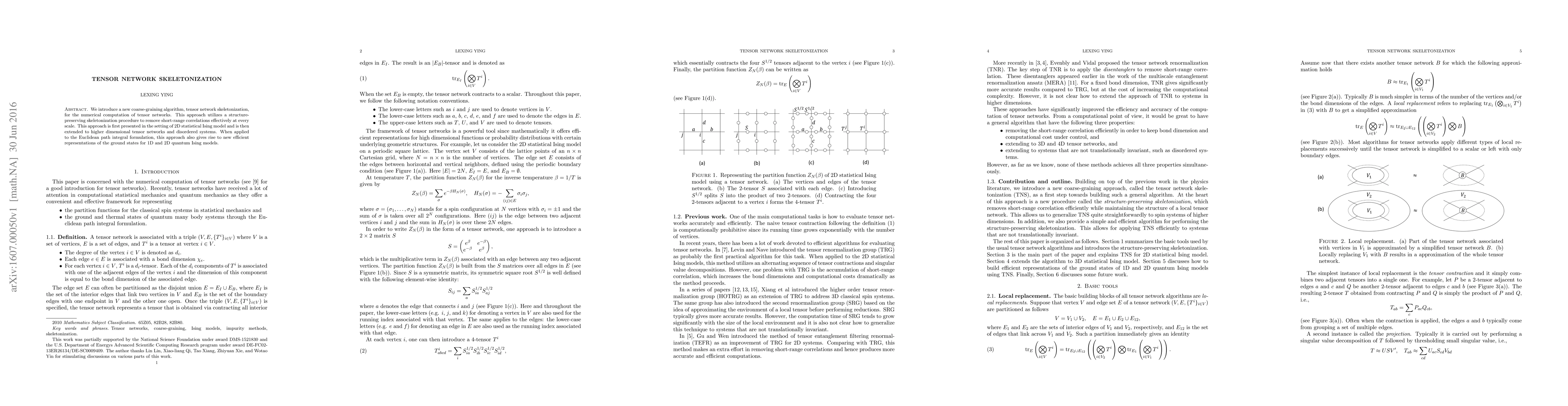 The paper introduces tensor network skeletonization, a novel coarse-graining algorithm that efficiently removes short-range correlations in tensor networks, demonstrated first in 2D Ising models and extended to higher dimensions, also yielding efficient ground state representations for quantum Ising models.