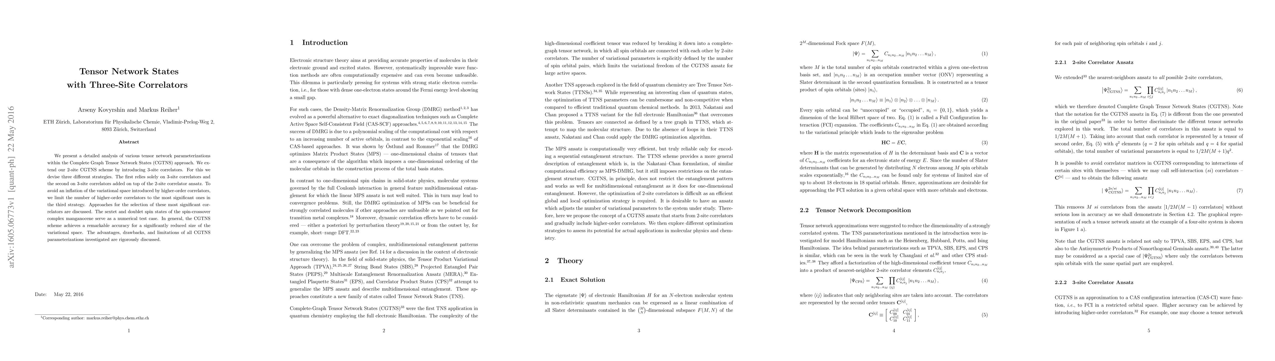 We present a detailed analysis of various tensor network parameterizations within the Complete Graph Tensor Network States (CGTNS) approach. We extend our 2-site CGTNS scheme by introducing 3-site correlators. For this we devise three different strategies. The first relies solely on 3-site correlators and the second on 3-site correlators added on top of the 2-site correlator ansatz. To avoid an inflation of the variational space introduced by higher-order correlators, we limit the number of higher-order correlators to the most significant ones in the third strategy. Approaches for the selection of these most significant correlators are discussed. The sextet and doublet spin states of the spin-crossover complex manganocene serve as a numerical test case. In general, the CGTNS scheme achieves a remarkable accuracy for a significantly reduced size of the variational space. The advantages, drawbacks, and limitations of all CGTNS parameterizations investigated are rigorously discussed.