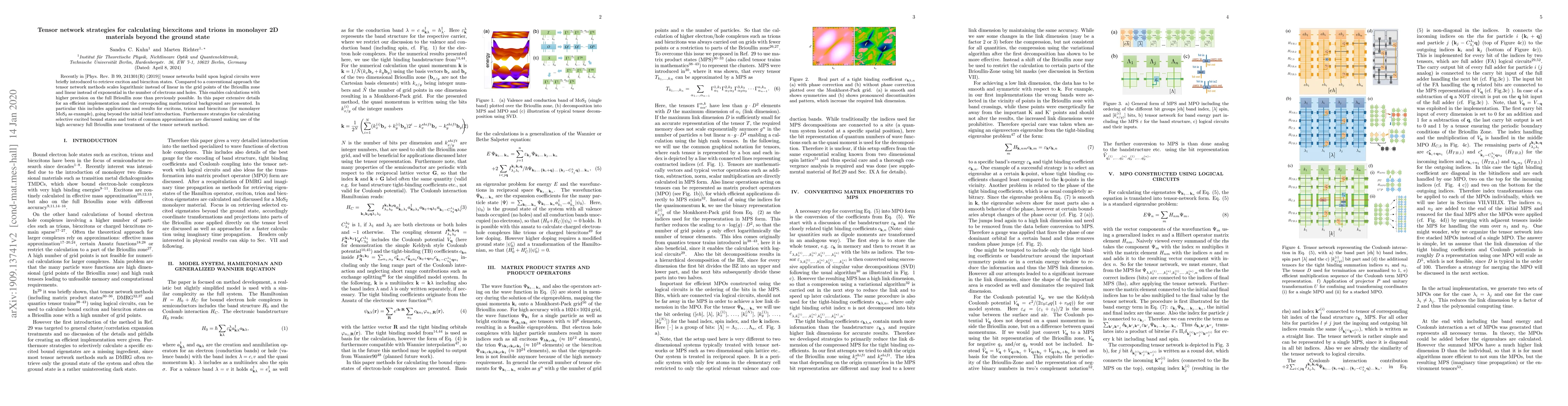 Recently in [Phys. Rev. B 99, 241301(R) (2019)] tensor networks build upon logical circuits were briefly introduced to retrieve exciton and biexciton states. Compared to a conventional approach the tensor network methods scales logarithmic instead of linear in the grid points of the Brioullin zone and linear instead of exponential in the number of electrons and holes. This enables calculations with higher precision on the full Brioullin zone than previously possible. In this paper extensive details for an efficient implementation and the corresponding mathematical background are presented. In particular this includes applications and results for excitons, trions and biexcitons (for monolayer MoS$_2$ as example), going beyond the initial brief introduction. Furthermore strategies for calculating selective excited bound states and tests of common approximations are discussed making use of the high accuracy full Brioullin zone treatment of the tensor network method.