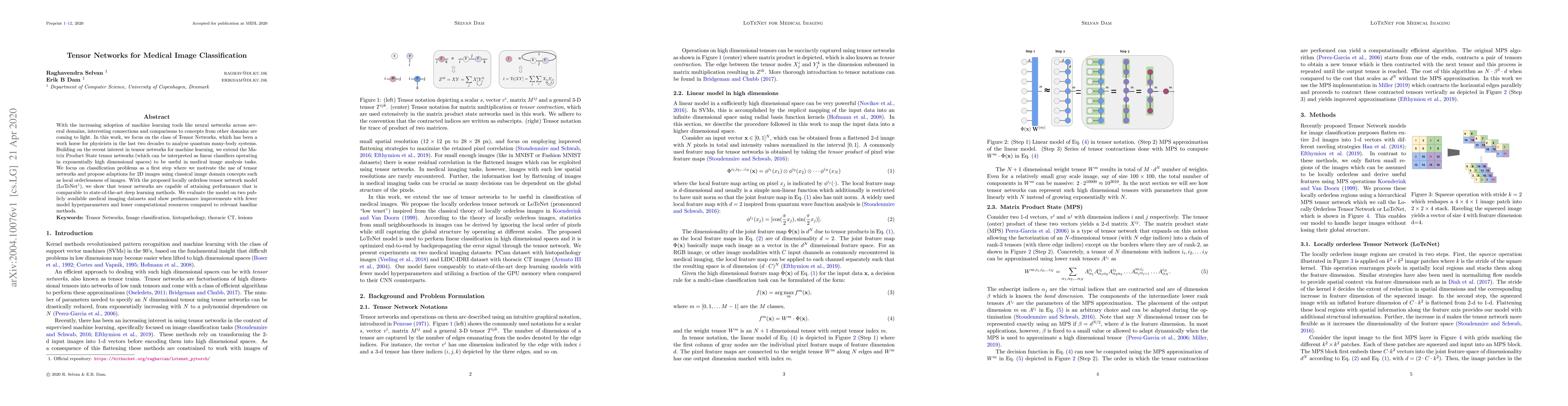 With the increasing adoption of machine learning tools like neural networks across several domains, interesting connections and comparisons to concepts from other domains are coming to light. In this work, we focus on the class of Tensor Networks, which has been a work horse for physicists in the last two decades to analyse quantum many-body systems. Building on the recent interest in tensor networks for machine learning, we extend the Matrix Product State tensor networks (which can be interpreted as linear classifiers operating in exponentially high dimensional spaces) to be useful in medical image analysis tasks. We focus on classification problems as a first step where we motivate the use of tensor networks and propose adaptions for 2D images using classical image domain concepts such as local orderlessness of images. With the proposed locally orderless tensor network model (LoTeNet), we show that tensor networks are capable of attaining performance that is comparable to state-of-the-art deep learning methods. We evaluate the model on two publicly available medical imaging datasets and show performance improvements with fewer model hyperparameters and lesser computational resources compared to relevant baseline methods.