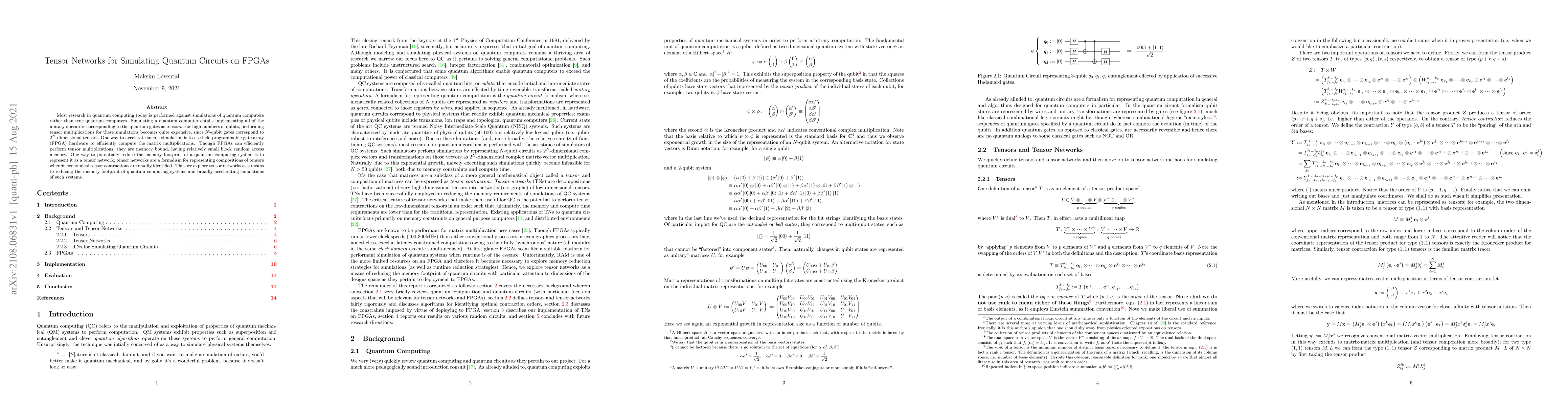 Most research in quantum computing today is performed against simulations of quantum computers rather than true quantum computers. Simulating a quantum computer entails implementing all of the unitary operators corresponding to the quantum gates as tensors. For high numbers of qubits, performing tensor multiplications for these simulations becomes quite expensive, since $N$-qubit gates correspond to $2^{N}$-dimensional tensors. One way to accelerate such a simulation is to use field programmable gate array (FPGA) hardware to efficiently compute the matrix multiplications. Though FPGAs can efficiently perform tensor multiplications, they are memory bound, having relatively small block random access memory. One way to potentially reduce the memory footprint of a quantum computing system is to represent it as a tensor network; tensor networks are a formalism for representing compositions of tensors wherein economical tensor contractions are readily identified. Thus we explore tensor networks as a means to reducing the memory footprint of quantum computing systems and broadly accelerating simulations of such systems.