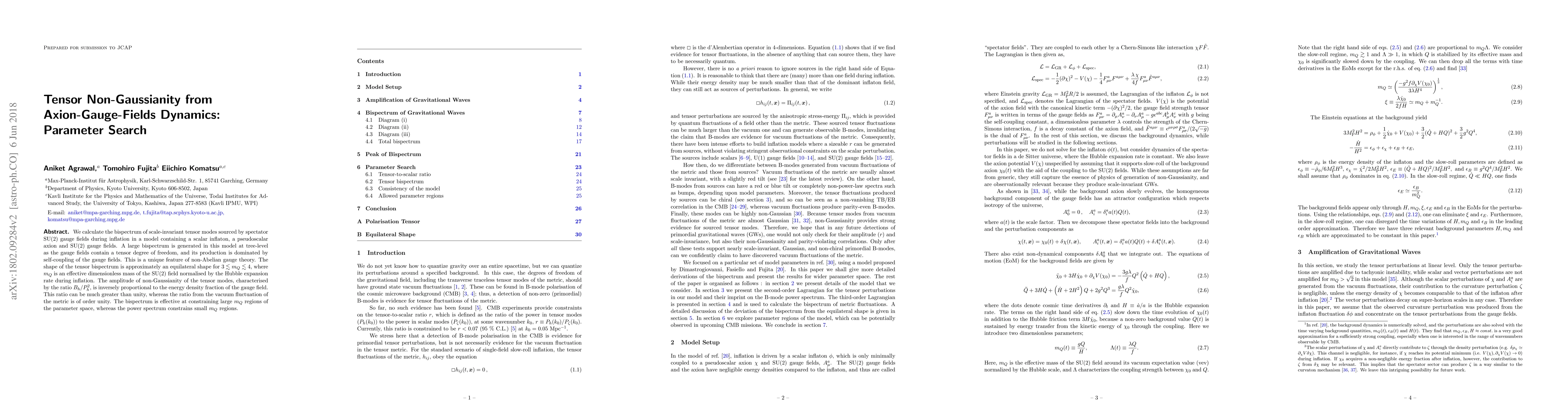 Researchers found that a specific model of inflation can generate large bispectra for tensor modes due to self-coupling of SU(2) gauge fields, with the shape resembling an equilateral triangle at certain mass ranges.