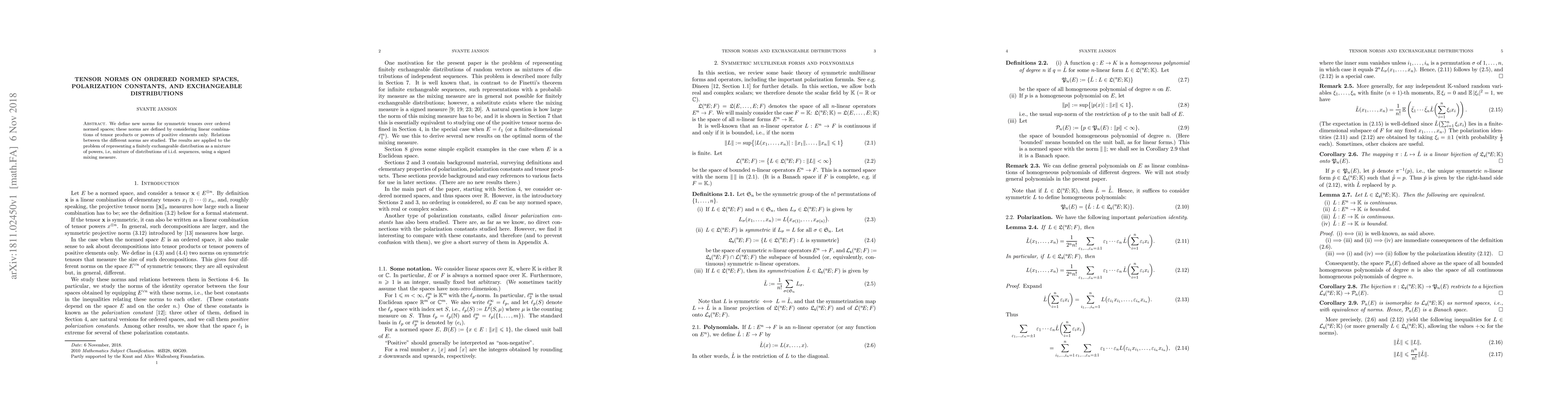 The paper introduces new norms for symmetric tensors in ordered normed spaces, focusing on positive elements, and explores their relationships. It applies these norms to represent finitely exchangeable distributions as mixtures of powers using a signed mixing measure.