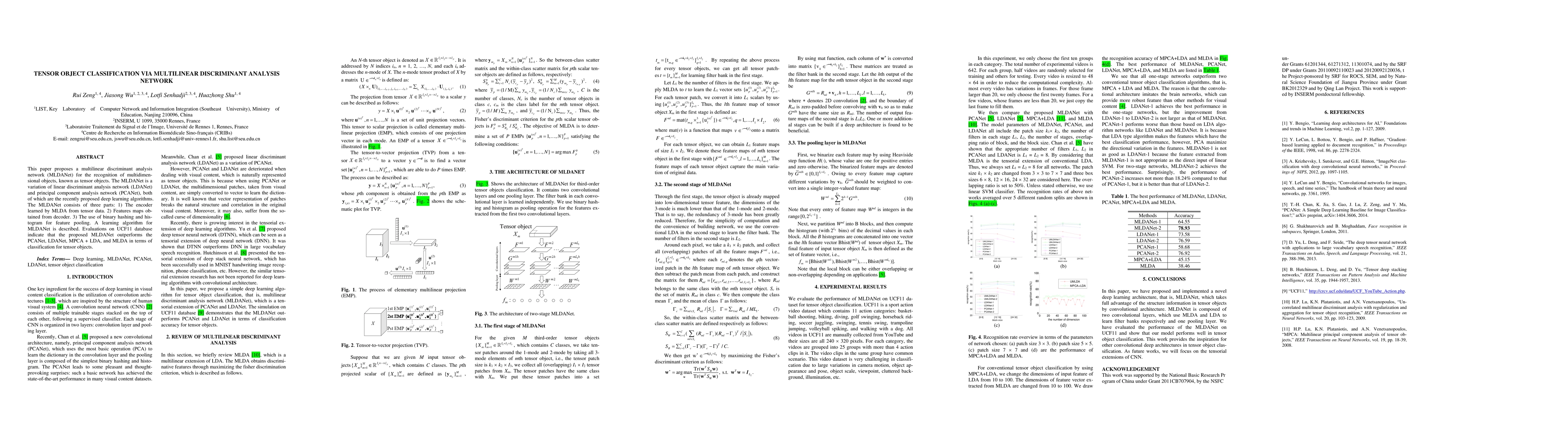This paper introduces MLDANet, a multilinear discriminant analysis network for tensor object classification, outperforming PCANet, LDANet, MPCA + LDA, and MLDA in evaluations on the UCF11 database. The network combines MLDA-based encoder, feature maps from decoder, and binary hashing for feature pooling.