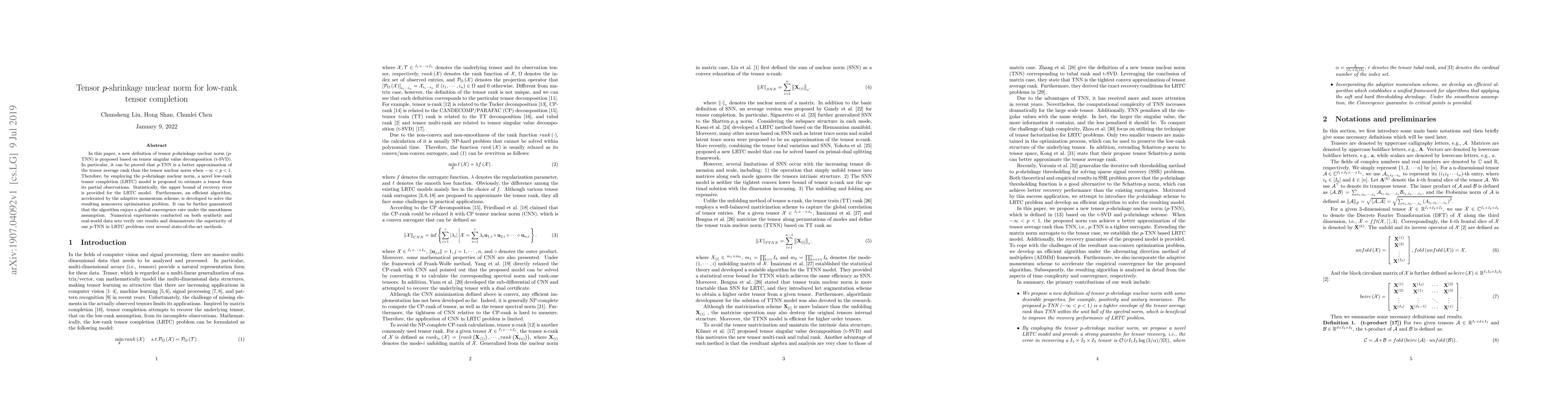 This paper introduces a tensor p-shrinkage nuclear norm (p-TNN) for low-rank tensor completion, proving it to be a better rank approximation than the tensor nuclear norm for p < 1. An efficient algorithm with adaptive momentum is developed to solve the nonconvex optimization problem, demonstrating superior performance in tensor completion tasks compared to other methods.