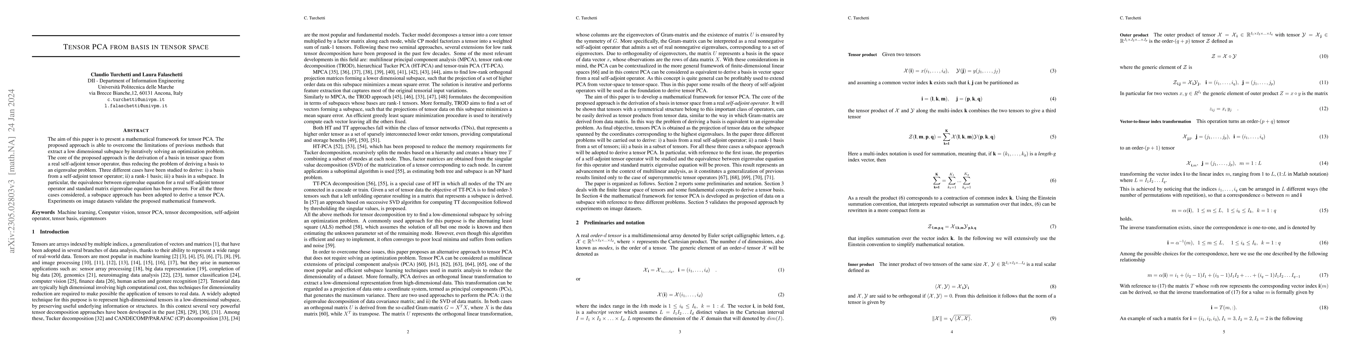 This paper introduces a new mathematical framework for tensor PCA by deriving a basis in tensor space from a real self-adjoint tensor operator, transforming the problem into an eigenvalue problem. Experiments on image datasets validate the effectiveness of the proposed approach.