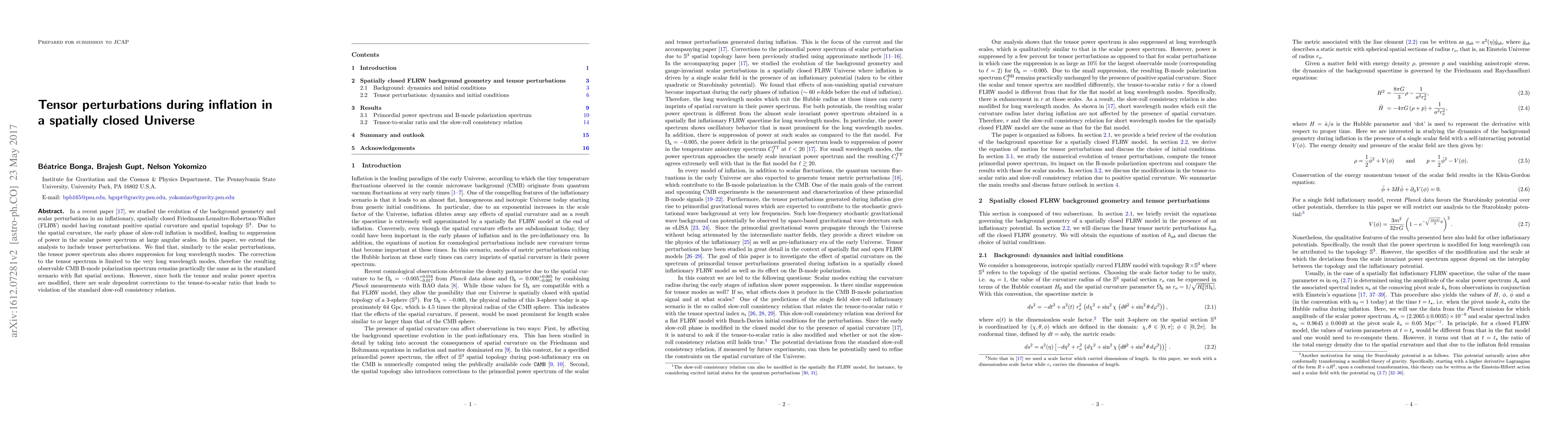 In a recent paper [17], we studied the evolution of the background geometry and scalar perturbations in an inflationary, spatially closed Friedmann-Lema\^itre-Robertson-Walker (FLRW) model having constant positive spatial curvature and spatial topology $\mathbb S^3$. Due to the spatial curvature, the early phase of slow-roll inflation is modified, leading to suppression of power in the scalar power spectrum at large angular scales. In this paper, we extend the analysis to include tensor perturbations. We find that --- similarly to the scalar perturbations --- the tensor power spectrum also shows power suppression for long wavelength modes. The correction to the tensor spectrum is limited to the very long wavelength modes, therefore the resulting observable CMB B-mode polarization spectrum remains practically the same as in the standard scenario with flat spatial sections. However, since both the tensor and scalar power spectra are modified, there are scale dependent corrections to the tensor-to-scalar ratio that lead to violation of the standard slow-roll consistency relation.