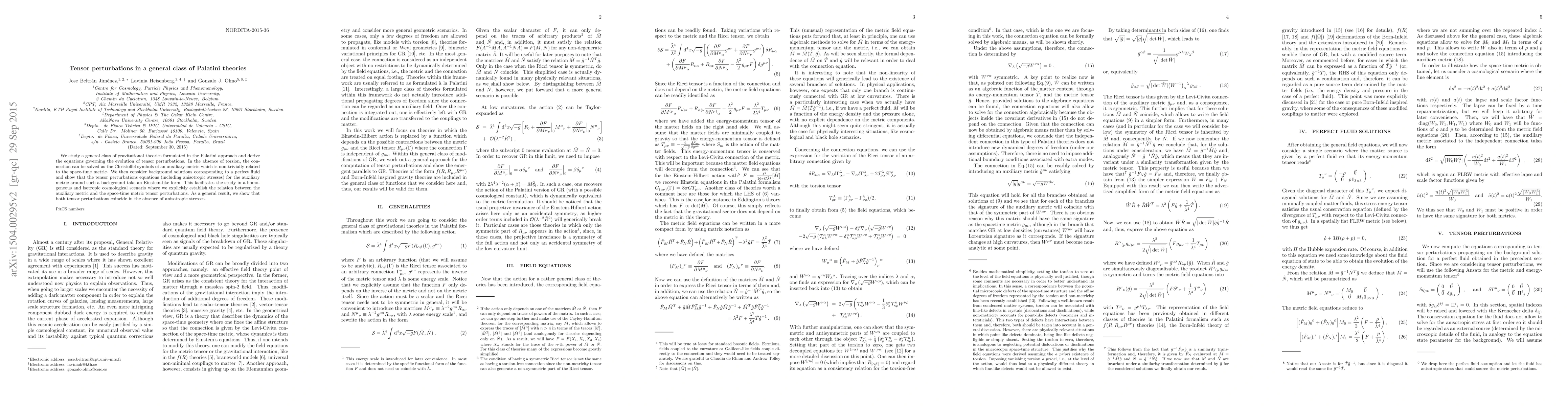 We study a general class of gravitational theories formulated in the Palatini approach and derive the equations governing the evolution of tensor perturbations. In the absence of torsion, the connection can be solved as the Christoffel symbols of an auxiliary metric which is non-trivially related to the space-time metric. We then consider background solutions corresponding to a perfect fluid and show that the tensor perturbations equations (including anisotropic stresses) for the auxiliary metric around such a background take an Einstein-like form. This facilitates the study in a homogeneous and isotropic cosmological scenario where we explicitly establish the relation between the auxiliary metric and the space-time metric tensor perturbations. As a general result, we show that both tensor perturbations coincide in the absence of anisotropic stresses.