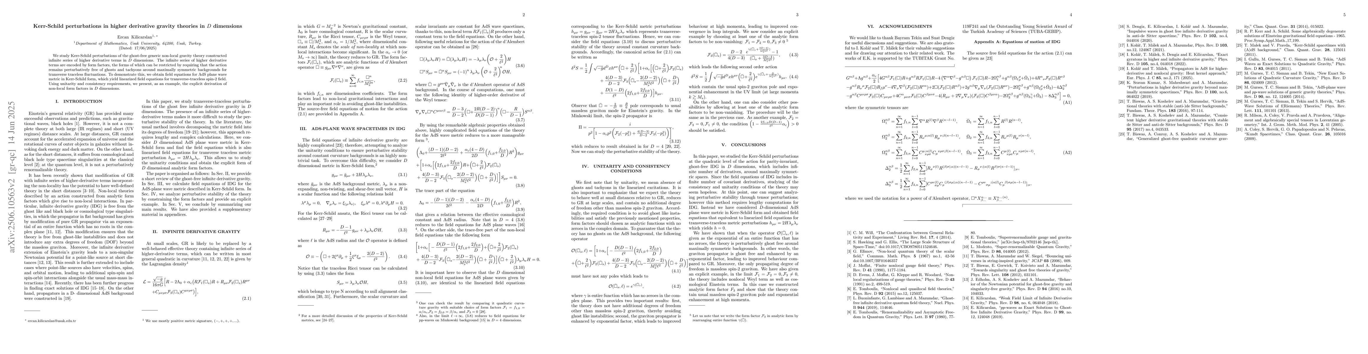 The paper presents a detailed analysis of tensor perturbations in higher derivative gravity theories, deriving field equations for AdS plane wave metrics in Kerr-Schild form and ensuring perturbative stability by choosing appropriate non-local form factors.