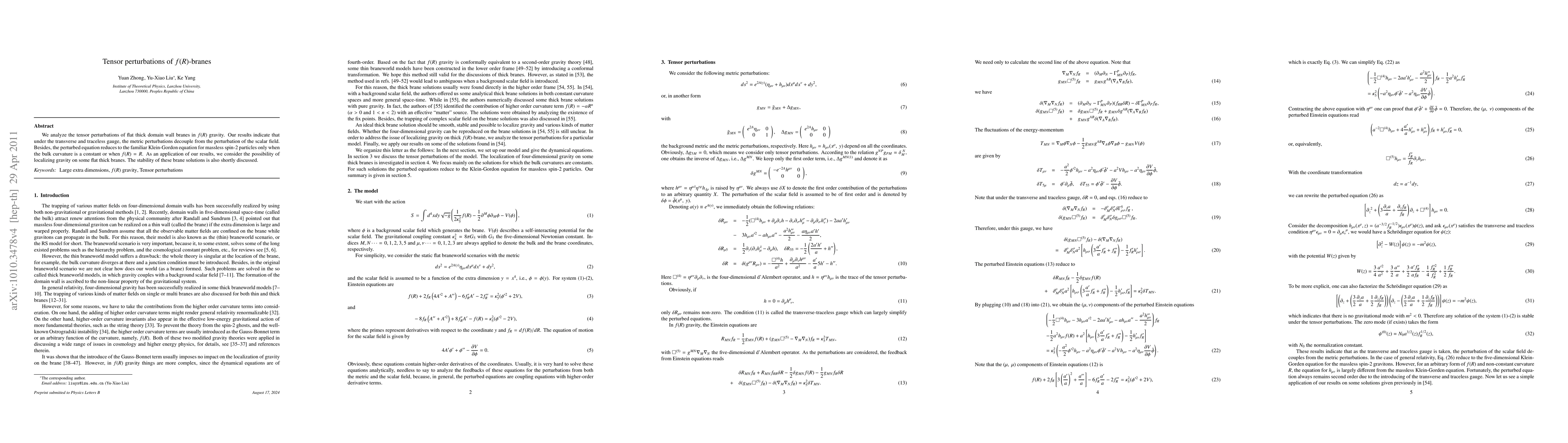 This paper investigates tensor perturbations in $f(R)$ gravity for flat thick domain wall branes, revealing that metric perturbations decouple from scalar field perturbations. It finds that the perturbed equation resembles the Klein-Gordon equation for massless spin-2 particles under specific conditions, and discusses the implications for localizing gravity on these branes and their stability.