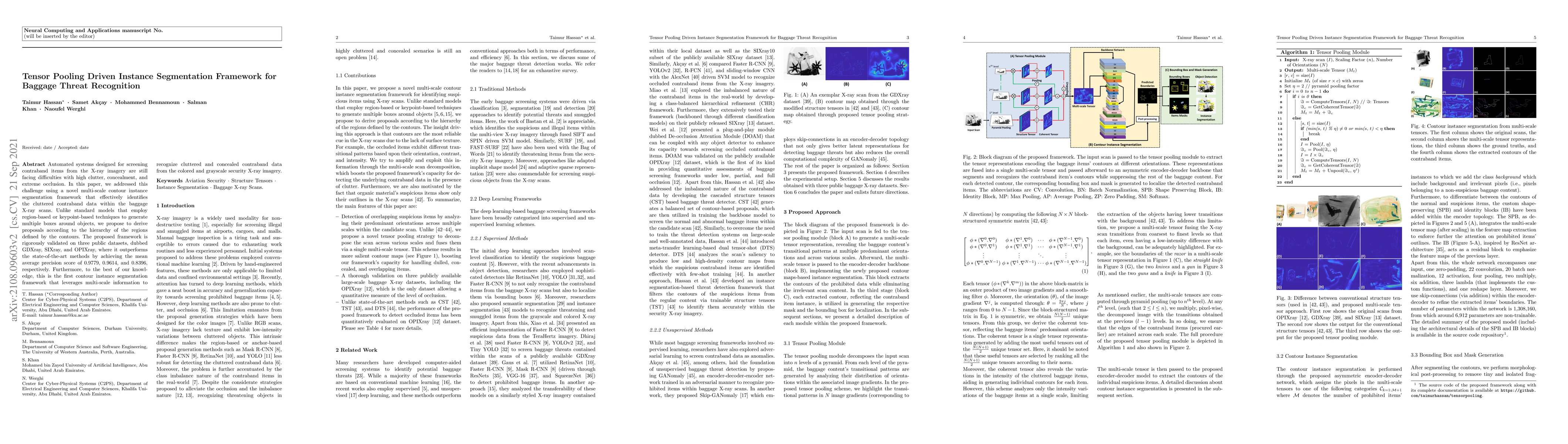 This paper introduces a novel multi-scale contour instance segmentation framework for identifying contraband in baggage X-ray scans, outperforming existing methods on three datasets. It leverages tensor pooling to derive proposals based on region hierarchies, achieving high mean average precision scores.