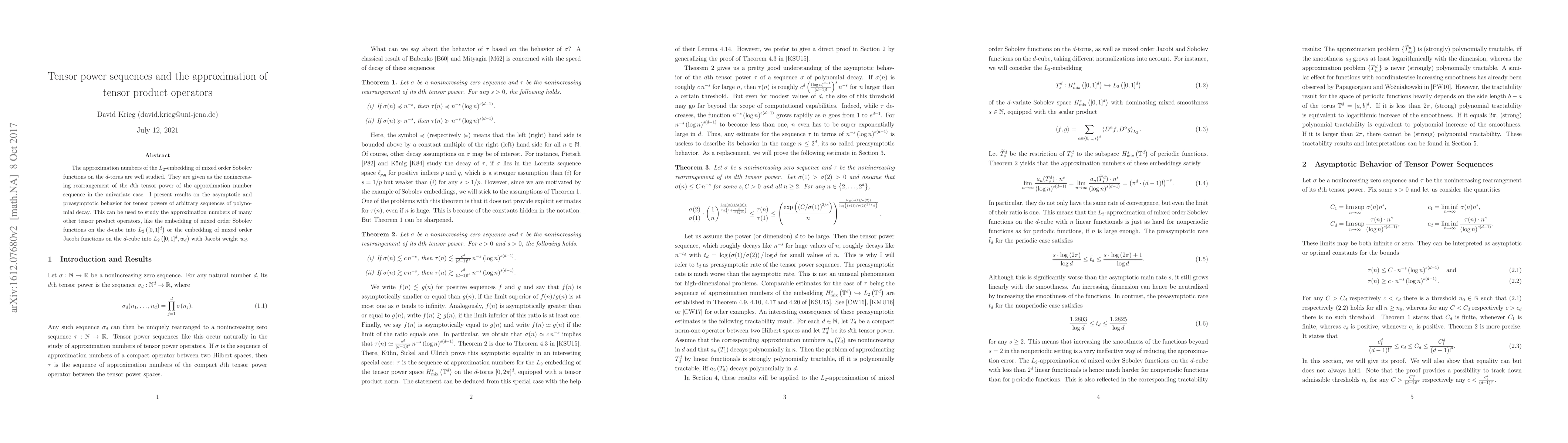 The approximation numbers of the $L_2$-embedding of mixed order Sobolev functions on the $d$-torus are well studied. They are given as the nonincreasing rearrangement of the $d$-th tensor power of the approximation number sequence in the univariate case. I present results on the asymptotic and preasymptotic behavior for tensor powers of arbitrary sequences of polynomial decay. This can be used to study the approximation numbers of many other tensor product operators, like the embedding of mixed order Sobolev functions on the $d$-cube into $L_2\left([0,1]^d\right)$ or the embedding of mixed order Jacobi functions on the $d$-cube into $L_2\left([0,1]^d,w_d\right)$ with Jacobi weight $w_d$.