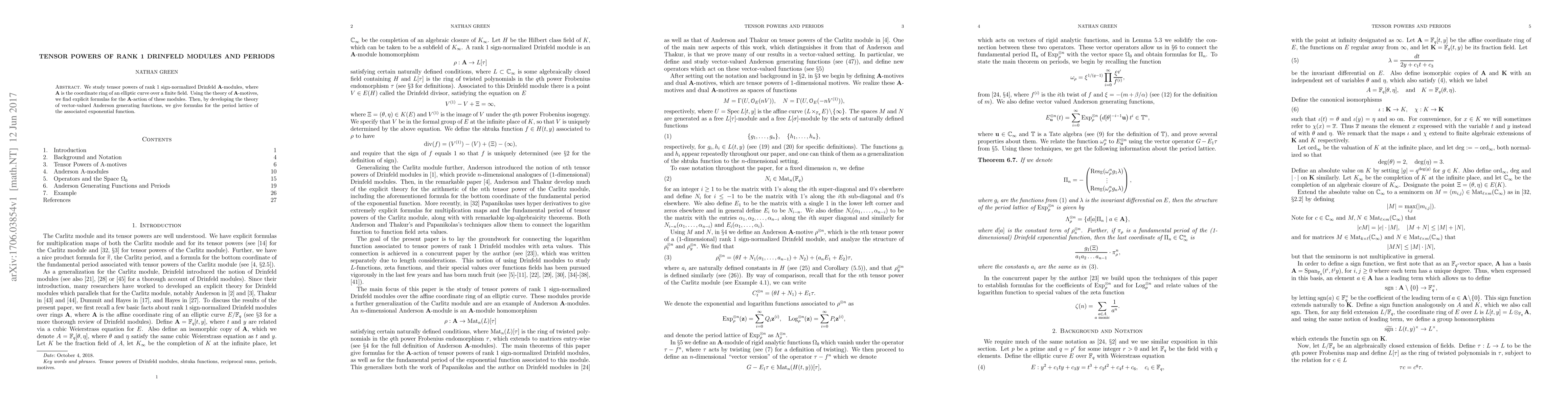 This paper explores tensor powers of rank 1 Drinfeld modules over elliptic curves over finite fields, deriving explicit formulas for their A-action via A-motives and presenting period lattice formulas using vector-valued Anderson generating functions.