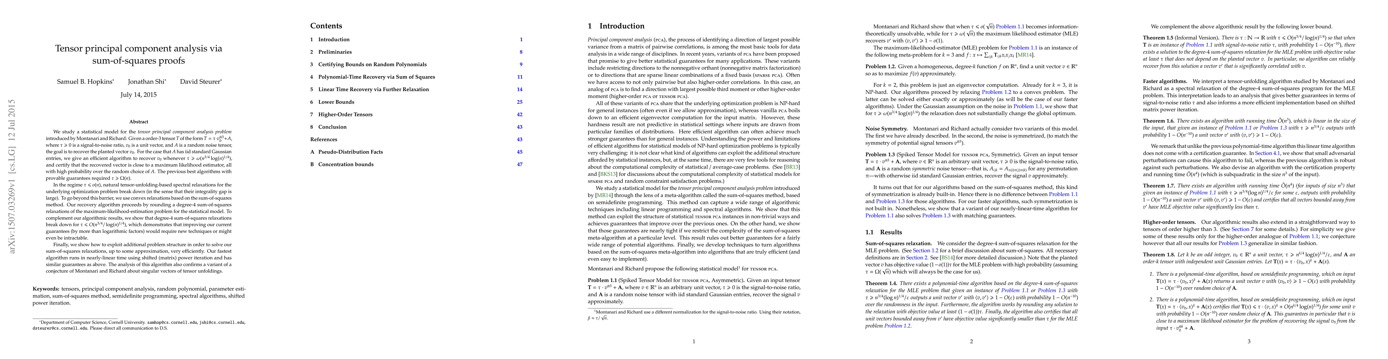 This paper presents an efficient algorithm for tensor principal component analysis using sum-of-squares proofs to recover a planted signal vector in a noisy tensor model, achieving better signal-to-noise ratio guarantees than previous methods. The algorithm leverages convex relaxations and runs in nearly-linear time.