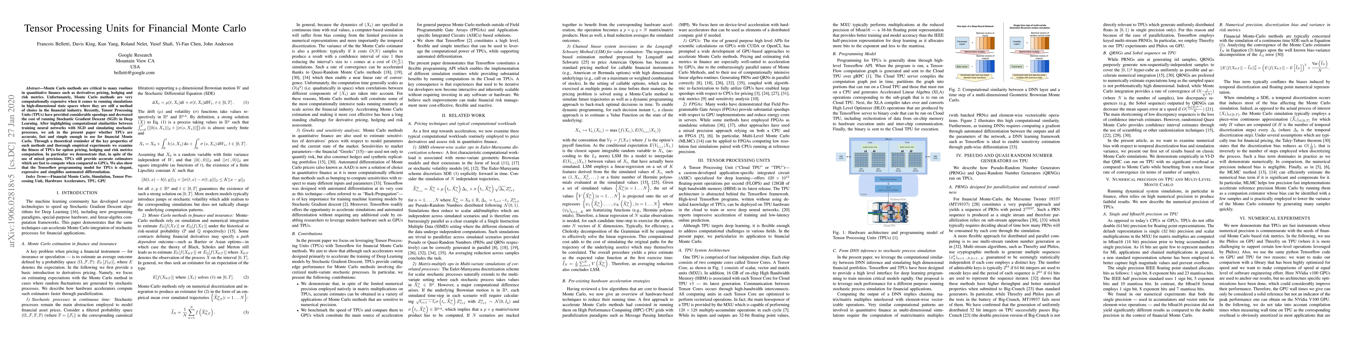 Monte Carlo methods are critical to many routines in quantitative finance such as derivatives pricing, hedging and risk metrics. Unfortunately, Monte Carlo methods are very computationally expensive when it comes to running simulations in high-dimensional state spaces where they are still a method of choice in the financial industry. Recently, Tensor Processing Units (TPUs) have provided considerable speedups and decreased the cost of running Stochastic Gradient Descent (SGD) in Deep Learning. After highlighting computational similarities between training neural networks with SGD and simulating stochastic processes, we ask in the present paper whether TPUs are accurate, fast and simple enough to use for financial Monte Carlo. Through a theoretical reminder of the key properties of such methods and thorough empirical experiments we examine the fitness of TPUs for option pricing, hedging and risk metrics computation. In particular we demonstrate that, in spite of the use of mixed precision, TPUs still provide accurate estimators which are fast to compute when compared to GPUs. We also show that the Tensorflow programming model for TPUs is elegant, expressive and simplifies automated differentiation.