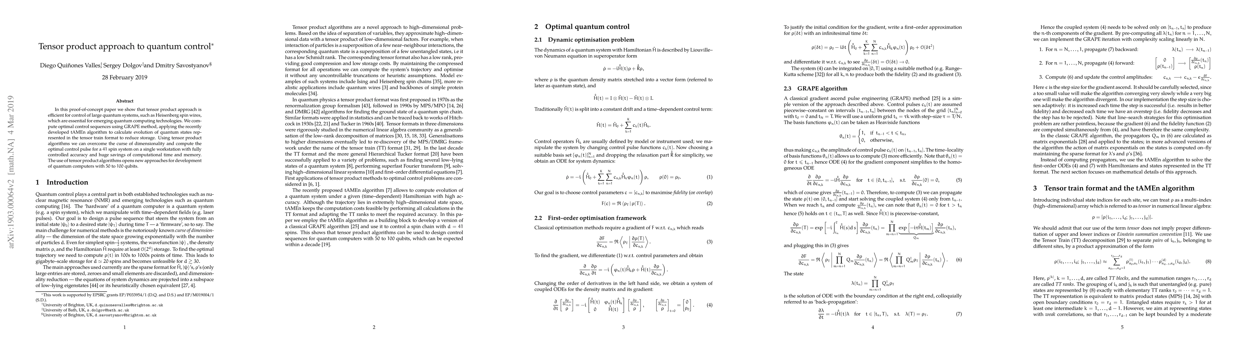 In this proof-of-concept paper we show that tensor product approach is efficient for control of large quantum systems, such as Heisenberg spin wires, which are essential for emerging quantum computing technologies. We compute optimal control sequences using GRAPE method, applying the recently developed tAMEn algorithm to calculate evolution of quantum states represented in the tensor train format to reduce storage. Using tensor product algorithms we can overcome the curse of dimensionality and compute the optimal control pulse for a 41 spin system on a single workstation with fully controlled accuracy and huge savings of computational time and memory. The use of tensor product algorithms opens new approaches for development of quantum computers with 50 to 100 qubits.