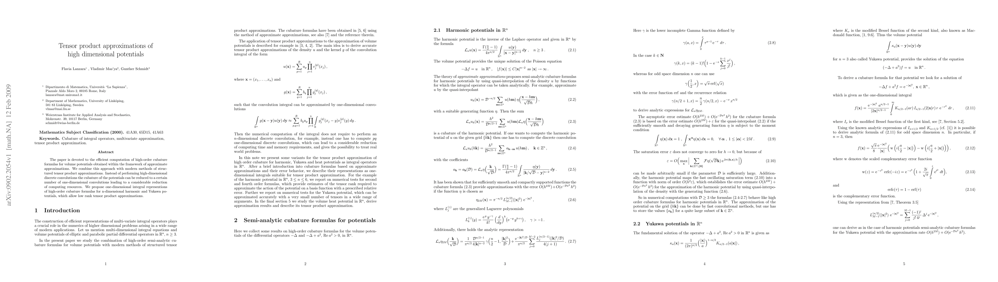 This paper presents a method for efficiently computing high-order cubature formulas for volume potentials by leveraging structured tensor product approximations, significantly reducing computational resources compared to traditional high-dimensional convolutions. It proposes one-dimensional integral representations for n-dimensional harmonic and Yukawa potentials, enabling low-rank tensor product approximations.