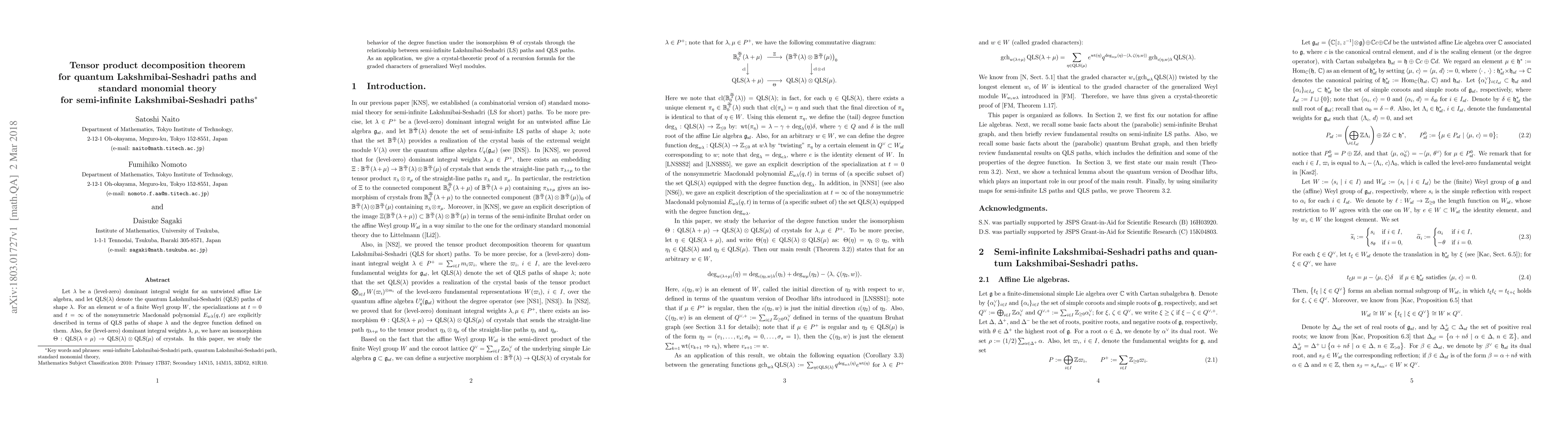 Let $\lambda$ be a (level-zero) dominant integral weight for an untwisted affine Lie algebra, and let $\mathrm{QLS}(\lambda)$ denote the quantum Lakshmibai-Seshadri (QLS) paths of shape $\lambda$. For an element $w$ of a finite Weyl group $W$, the specializations at $t = 0$ and $t = \infty$ of the nonsymmetric Macdonald polynomial $E_{w \lambda}(q, t)$ are explicitly described in terms of QLS paths of shape $\lambda$ and the degree function defined on them. Also, for (level-zero) dominant integral weights $\lambda$, $\mu$, we have an isomorphism $\Theta : \mathrm{QLS}(\lambda + \mu) \rightarrow \mathrm{QLS}(\lambda) \otimes \mathrm{QLS}(\mu)$ of crystals. In this paper, we study the behavior of the degree function under the isomorphism $\Theta$ of crystals through the relationship between semi-infinite Lakshmibai-Seshadri (LS) paths and QLS paths. As an application, we give a crystal-theoretic proof of a recursion formula for the graded characters of generalized Weyl modules.
