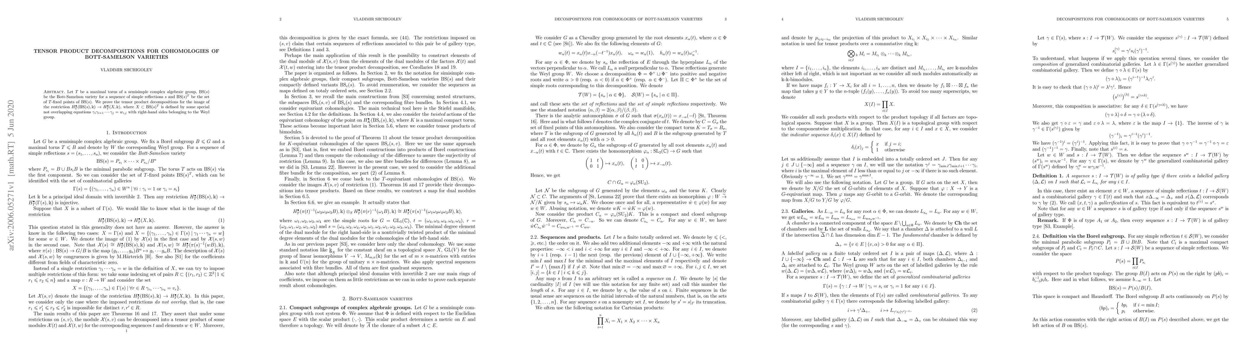 Let $T$ be a maximal torus of a semisimple complex algebraic group, $\mathrm{BS}(s)$ be the Bott-Samelson variety for a sequence of simple reflections $s$ and $\mathrm{BS}(s)^T$ be the set of $T$-fixed points of $\mathrm{BS}(s)$. We prove the tensor product decompositions for the image of the restriction $H^\bullet_T(\mathrm{BS}(s),k)\to H_T^\bullet(X,k)$, where $X\subset\mathrm{BS}(s)^T$ is defined by some special not overlapping equations $\gamma_i\gamma_{i+1}\cdots\gamma_j=w_{i,j}$ with right-hand sides belonging to the Weyl group.