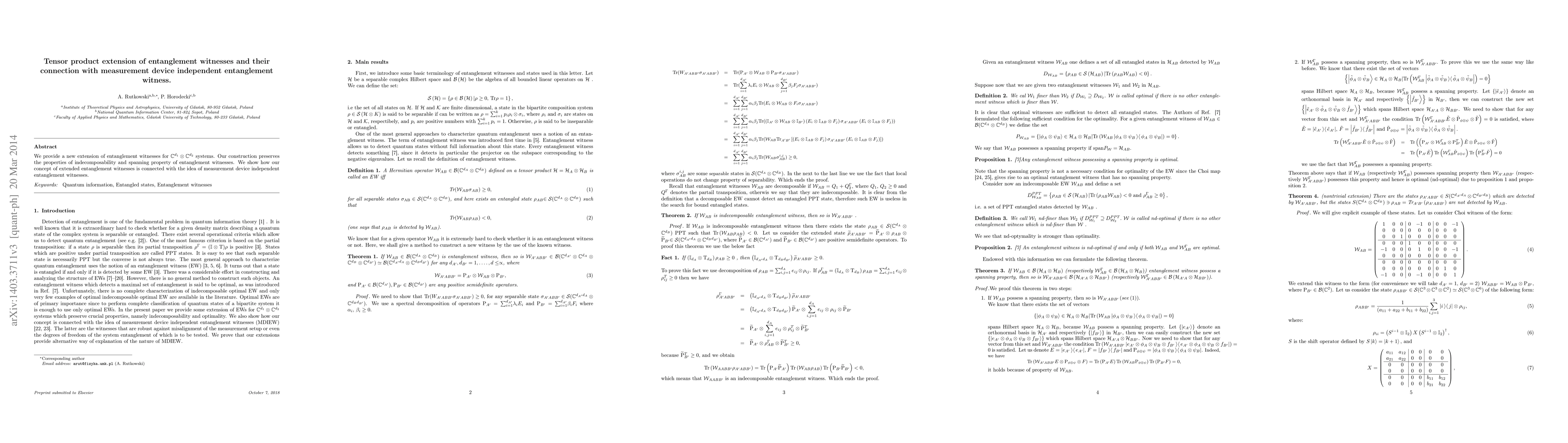 This paper introduces a new tensor product extension of entanglement witnesses for composite quantum systems, maintaining their essential properties. It also establishes a link between these extended entanglement witnesses and measurement device independent entanglement.