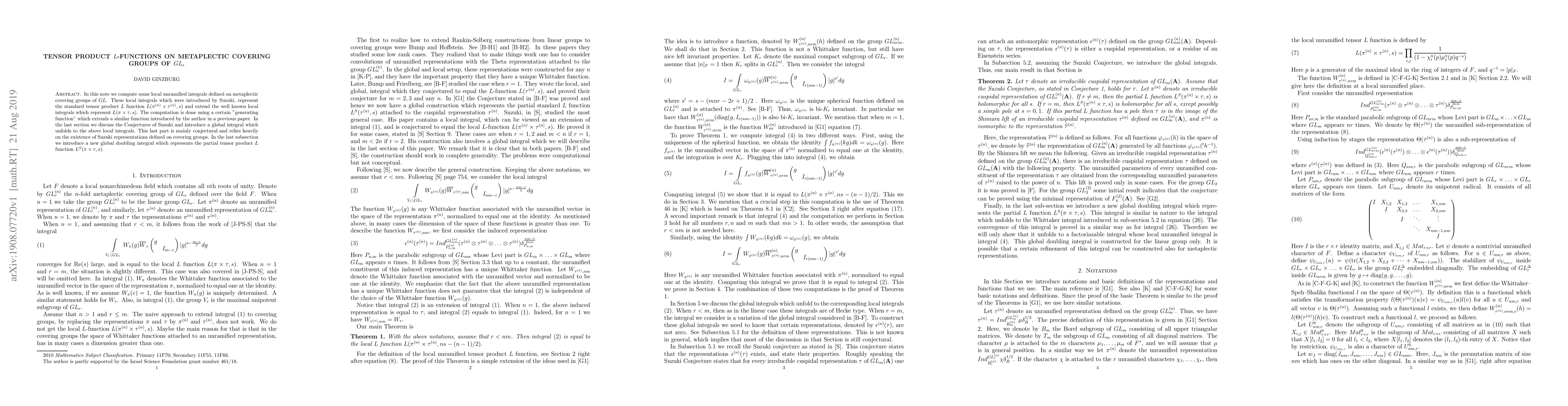 In this note we compute some local unramified integrals defined on metaplectic covering groups of $GL$. These local integrals which were introduced by Suzuki, represent the standard tensor product $L$ function $L(\pi^{(n)}\times \tau^{(n)},s)$ and extend the well known local integrals which represent $L(\pi\times \tau,s)$. The computation is done using a certain "generating function" which extends a similar function introduced by the author in a previous paper. In the last section we discuss the Conjectures of Suzuki and introduce a global integral which unfolds to the above local integrals. This last part is mainly conjectural and relies heavily on the existence of Suzuki representations defined on covering groups. In the last subsection we introduce a new global doubling integral which represents the partial tensor product $L$ function $L^S(\pi\times \tau,s)$.