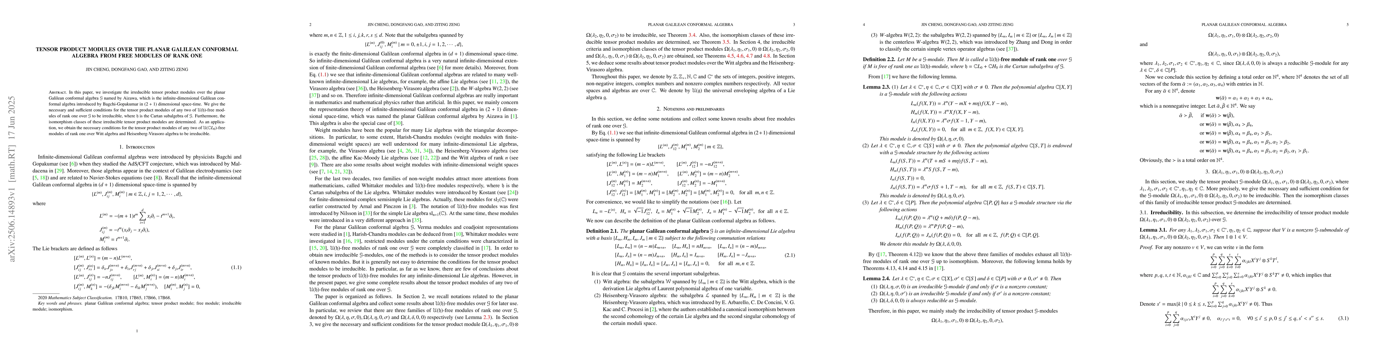 In this paper, we investigate the irreducible tensor product modules over the planar Galilean conformal algebra $\mathcal{G}$ named by Aizawa, which is the infinite-dimensional Galilean conformal algebra introduced by Bagchi-Gopakumar in $(2+1)$ dimensional space-time. We give the necessary and sufficient conditions for the tensor product modules of any two of $\mathcal{U}(\mathfrak{h})$-free modules of rank one over $\mathcal{G}$ to be irreducible, where $\mathfrak{h}$ is the Cartan subalgebra of $\mathcal{G}$.Furthermore, the isomorphism classes of these irreducible tensor product modules are determined. As an application, we obtain the necessary conditions for the tensor product modules of any two of $\mathcal{U}(\mathbb{C} L_0)$-free modules of rank one over Witt algebra and Heisenberg-Virasoro algebra to be irreducible.