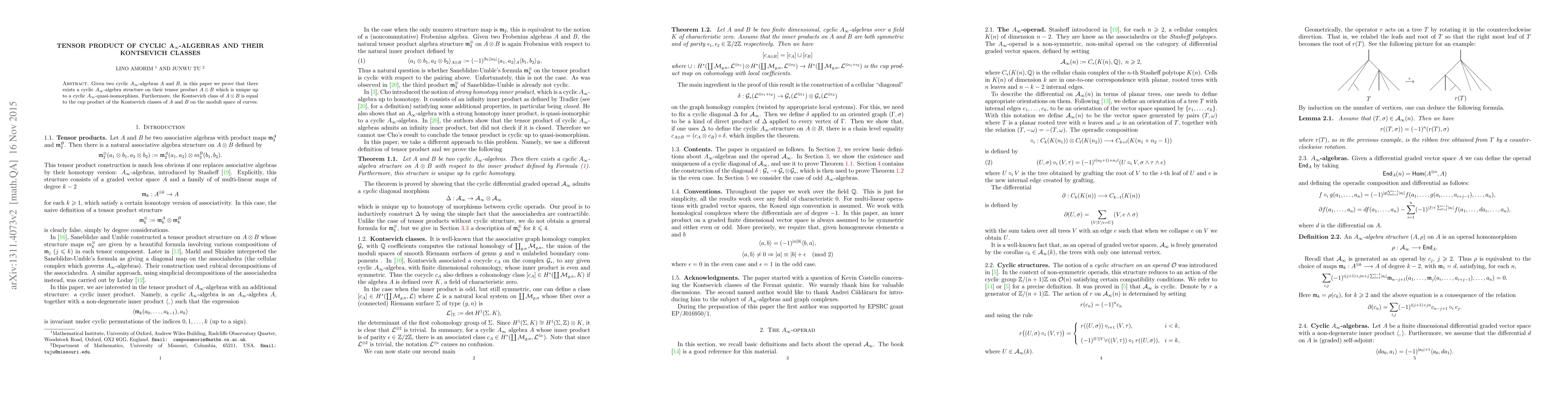 Given two cyclic A$_\infty$-algebras $A$ and $B$, we prove that there exists a cyclic A$_\infty$-algebra structure on their tensor product $A\otimes B$ which is unique up to a cyclic A$_\infty$-quasi-isomorphism. Furthermore, the Kontsevich class of $A\otimes B$ is equal to the cup product of the Kontsevich classes of $A$ and $B$ on the moduli space of curves.