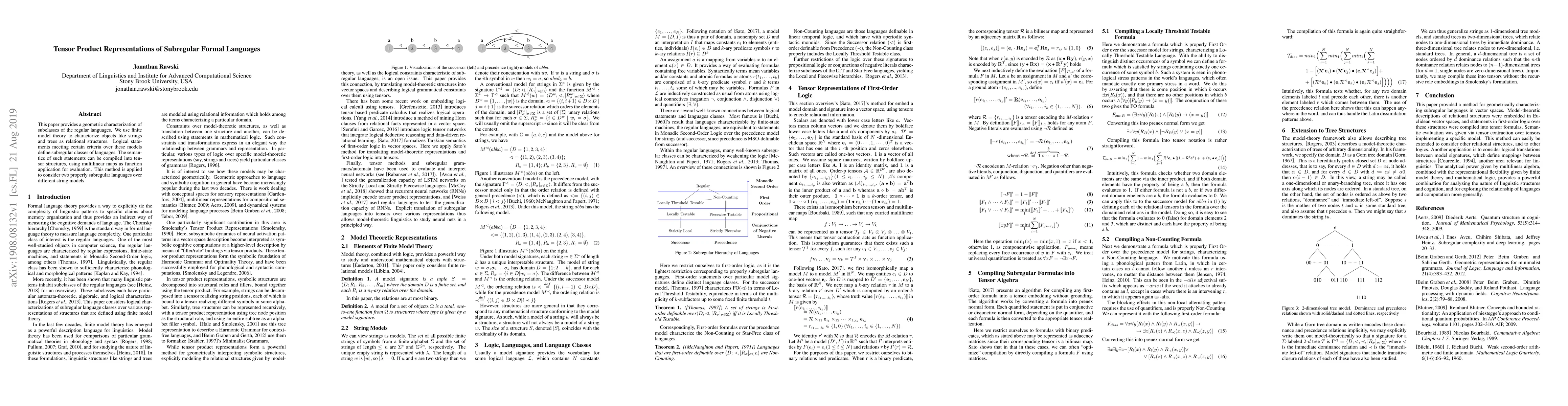 This paper provides a geometric characterization of subclasses of the regular languages. We use finite model theory to characterize objects like strings and trees as relational structures. Logical statements meeting certain criteria over these models define subregular classes of languages. The semantics of such statements can be compiled into tensor structures, using multilinear maps as function application for evaluation. This method is applied to consider two properly subregular languages over different string models.