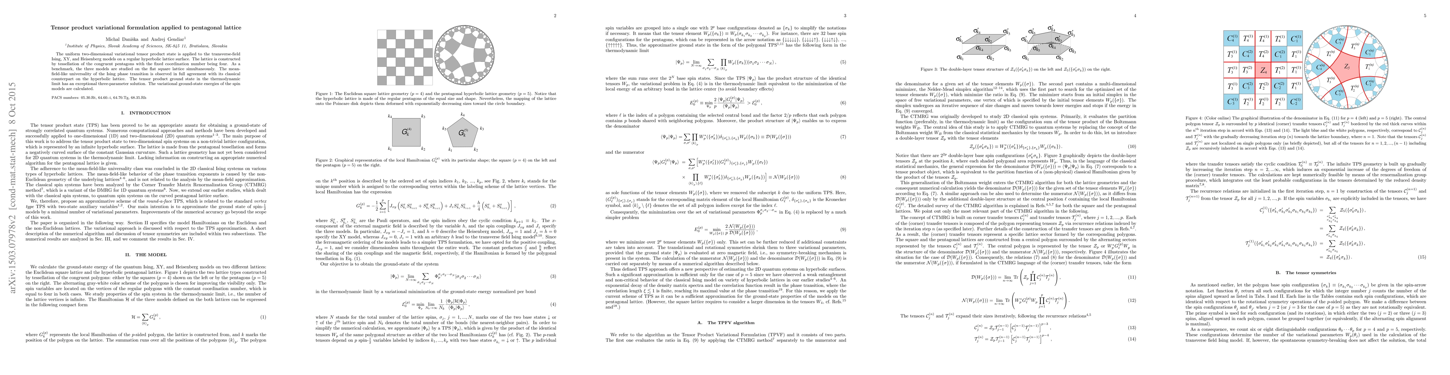 The uniform two-dimensional variational tensor product state is applied to the transverse-field Ising, XY, and Heisenberg models on a regular hyperbolic lattice surface. The lattice is constructed by tessellation of the congruent pentagons with the fixed coordination number being four. As a benchmark, the three models are studied on the flat square lattice simultaneously. The mean-field-like universality of the Ising phase transition is observed in full agreement with its classical counterpart on the hyperbolic lattice. The tensor product ground state in the thermodynamic limit has an exceptional three-parameter solution. The variational ground-state energies of the spin models are calculated.
