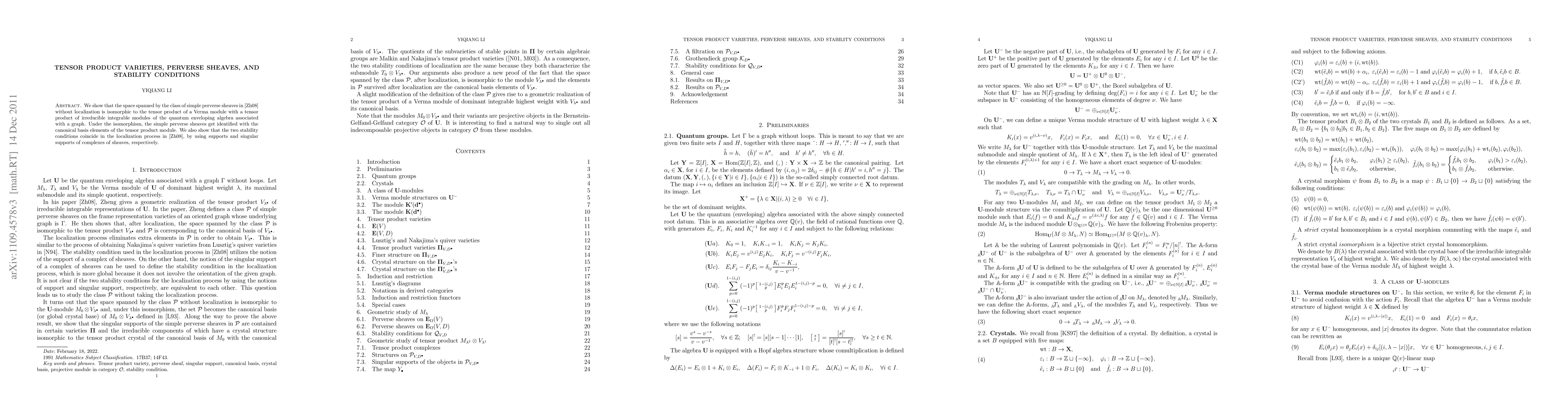 This paper demonstrates an isomorphism between the space of simple perverse sheaves and the tensor product of Verma modules and irreducible modules of a quantum enveloping algebra. It also shows that stability conditions align in the localization process using supports of sheaves.