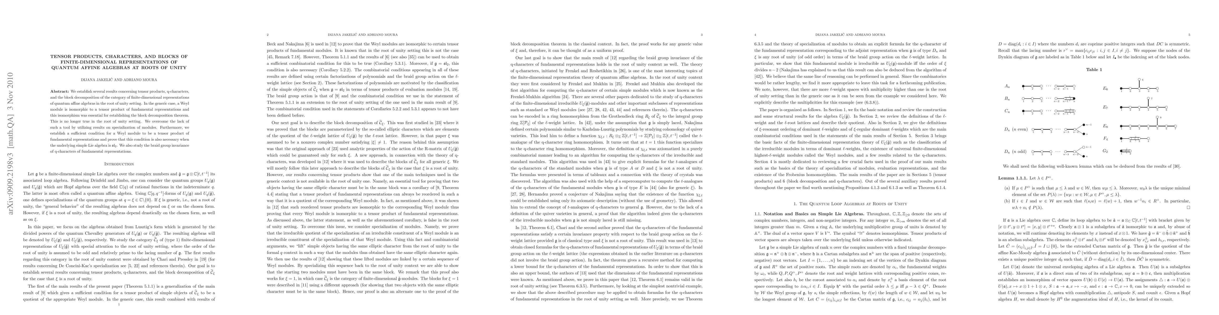 We establish several results concerning tensor products, q-characters, and the block decomposition of the category of finite-dimensional representations of quantum affine algebras in the root of unity setting. In the generic case, a Weyl module is isomorphic to a tensor product of fundamental representations and this isomorphism was essential for establishing the block decomposition theorem. This is no longer true in the root of unity setting. We overcome the lack of such a tool by utilizing results on specialization of modules. Furthermore, we establish a sufficient condition for a Weyl module to be a tensor product of fundamental representations and prove that this condition is also necessary when the underlying simple Lie algebra is sl(2). We also study the braid group invariance of q-characters of fundamental representations.