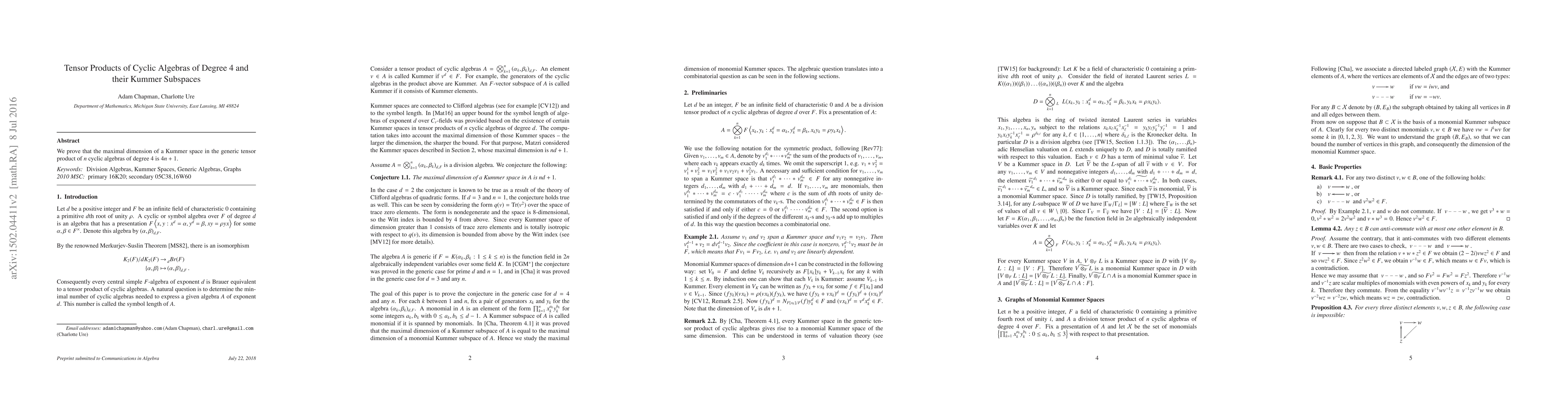 Summary: The study demonstrates that the largest possible dimension of a Kummer subspace in the generic tensor product of $n$ cyclic algebras of degree 4 is $4n+1$. This provides a significant result in the algebraic structure of cyclic algebras.