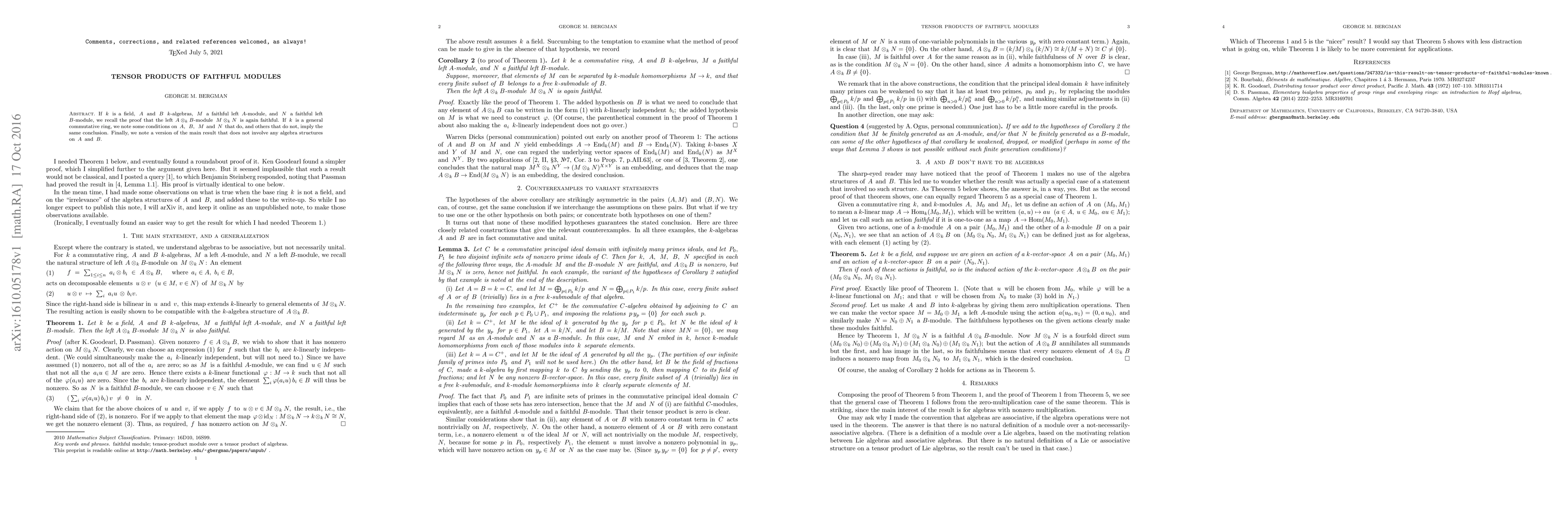 If $k$ is a field, $A$ and $B$ $k$-algebras, $M$ a faithful left $A$-module, and $N$ a faithful left $B$-module, we recall the proof that the left $A\otimes_k B$-module $M\otimes_k N$ is again faithful. If $k$ is a general commutative ring, we note some conditions on $A,$ $B,$ $M$ and $N$ that do, and others that do not, imply the same conclusion. Finally, we note a version of the main result that does not involve any algebra structures on $A$ and $B.$
