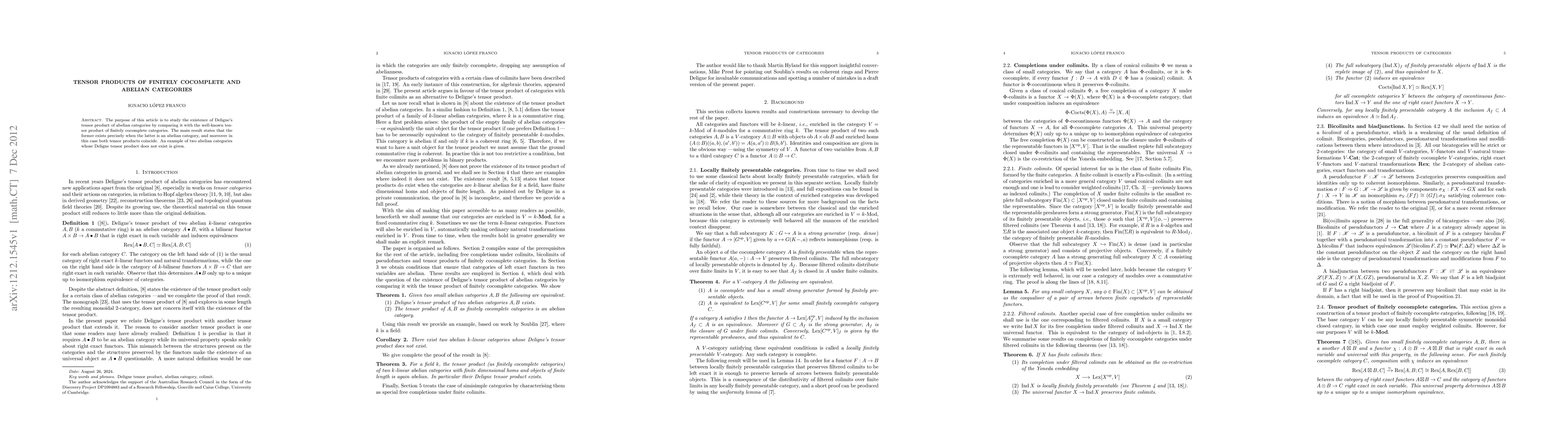 The purpose of this article is to study the existence of Deligne's tensor product of abelian categories by comparing it with the well-known ten- sor product of finitely cocomplete categories. The main result states that the former exists precisely when the latter is an abelian category, and moreover in this case both tensor products coincide. An example of two abelian categories whose Deligne tensor product does not exist is given.