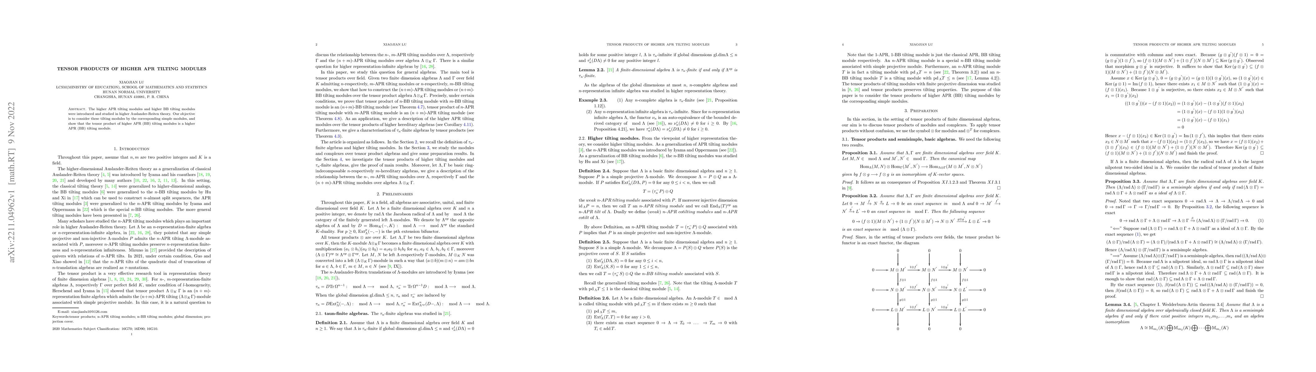 Summary: This paper investigates higher APR and BB tilting modules within higher Auslander-Reiten theory, demonstrating that the tensor product of these tilting modules remains a higher APR or BB tilting module.