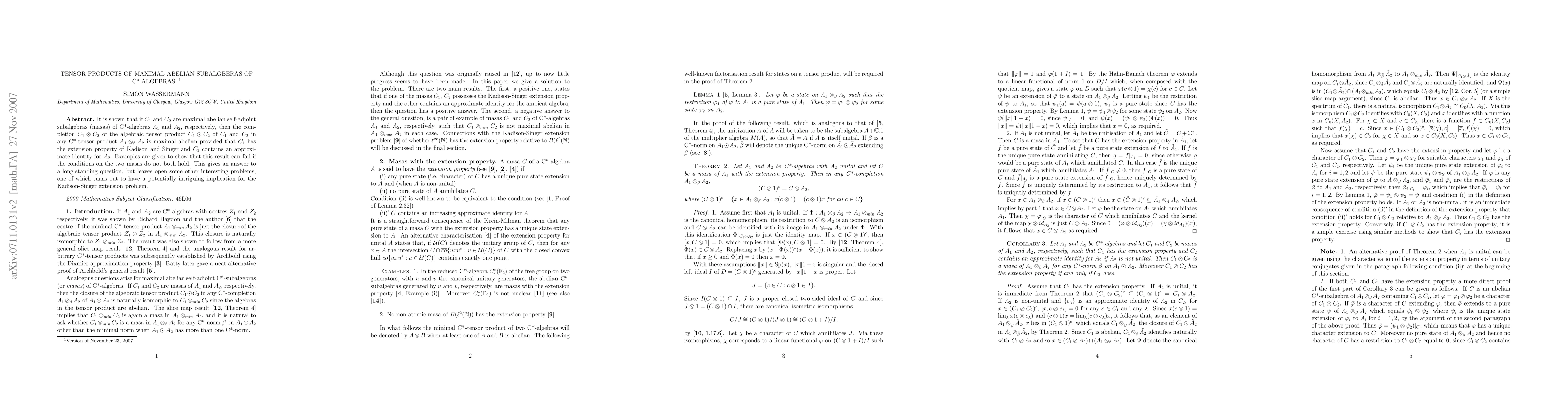 This paper demonstrates that the tensor product of two maximal abelian subalgebras of C*-algebras, under certain conditions, remains maximal abelian. It also provides an example where the tensor product fails to be maximal if neither subalgebra has specific properties, thus addressing a longstanding question while hinting at further implications for the Kadison-Singer extension problem.