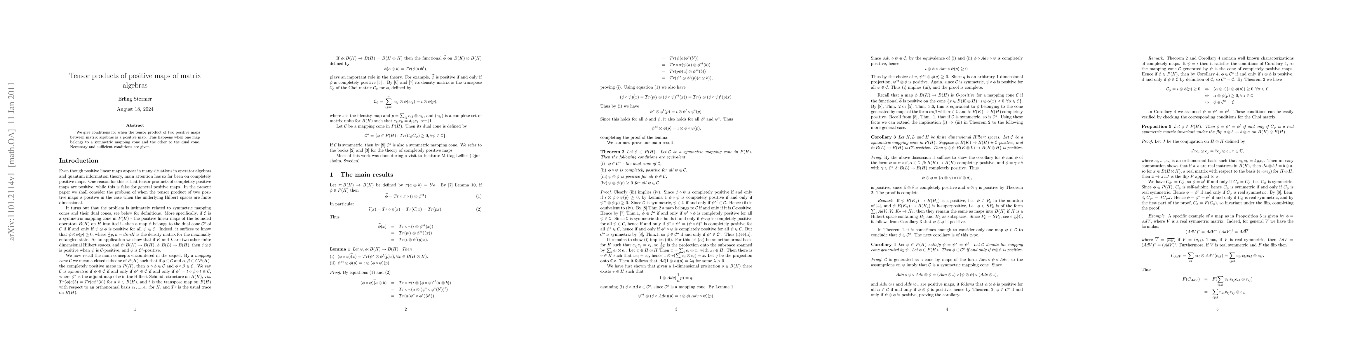 Summary: The paper establishes conditions for the tensor product of two positive maps between matrix algebras to remain positive, demonstrating that this occurs when one map is in a symmetric mapping cone and the other in its dual cone, providing both necessary and sufficient criteria.