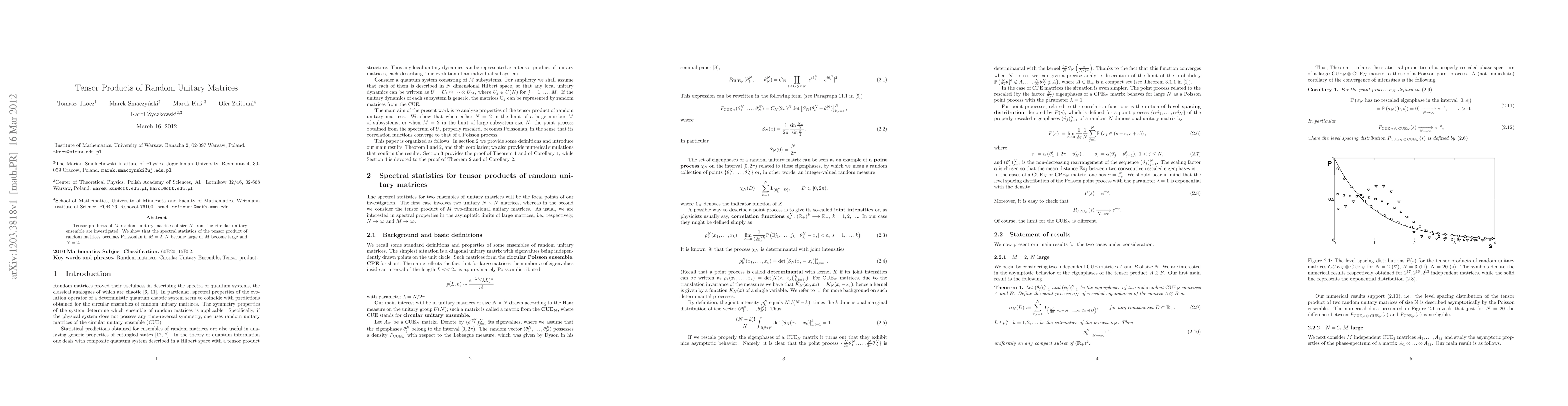 Summary: This study investigates tensor products of M random unitary matrices, revealing that their spectral statistics tend towards a Poisson distribution when either both M and N are large or when M is large while N is small (specifically N=2).