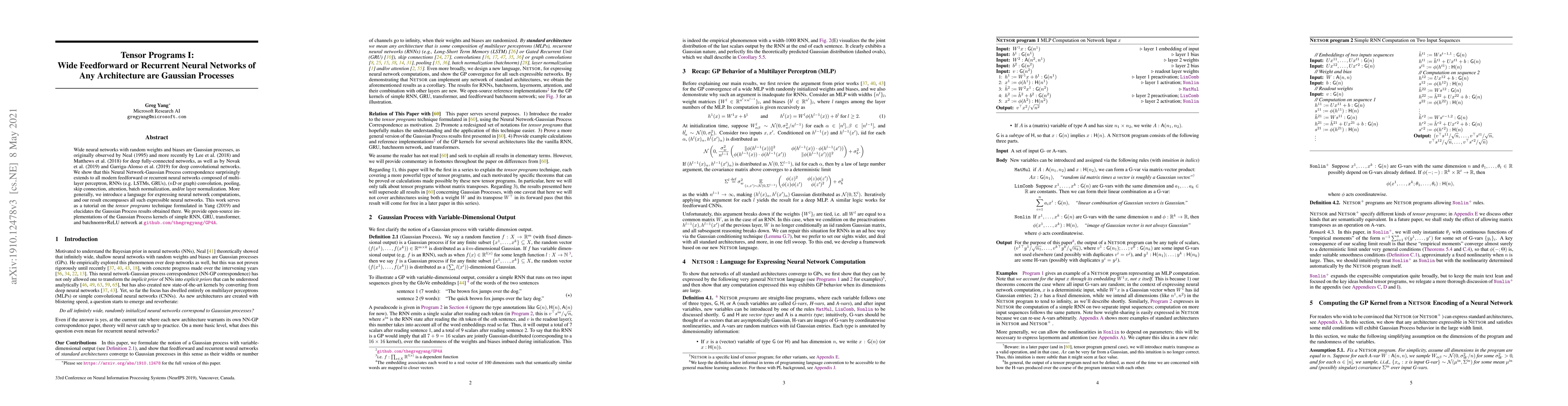 Wide neural networks with random weights and biases are Gaussian processes, as originally observed by Neal (1995) and more recently by Lee et al. (2018) and Matthews et al. (2018) for deep fully-connected networks, as well as by Novak et al. (2019) and Garriga-Alonso et al. (2019) for deep convolutional networks. We show that this Neural Network-Gaussian Process correspondence surprisingly extends to all modern feedforward or recurrent neural networks composed of multilayer perceptron, RNNs (e.g. LSTMs, GRUs), (nD or graph) convolution, pooling, skip connection, attention, batch normalization, and/or layer normalization. More generally, we introduce a language for expressing neural network computations, and our result encompasses all such expressible neural networks. This work serves as a tutorial on the *tensor programs* technique formulated in Yang (2019) and elucidates the Gaussian Process results obtained there. We provide open-source implementations of the Gaussian Process kernels of simple RNN, GRU, transformer, and batchnorm+ReLU network at github.com/thegregyang/GP4A.