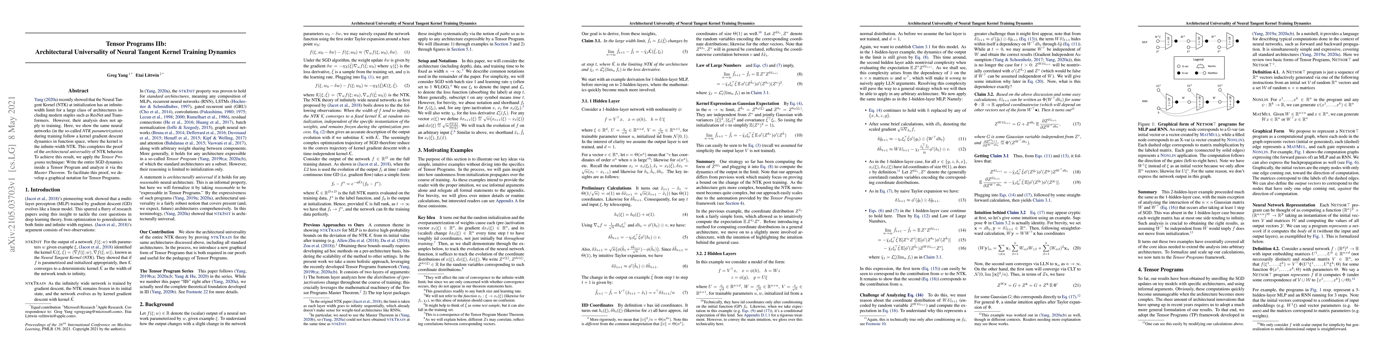 This paper demonstrates that neural networks, when analyzed through the Neural Tangent Kernel (NTK) framework, exhibit universal training dynamics akin to kernel gradient descent, thus proving the architectural universality of NTK behavior. The authors utilize the Tensor Programs technique to rigorously analyze the training dynamics and introduce a graphical notation for better understanding.