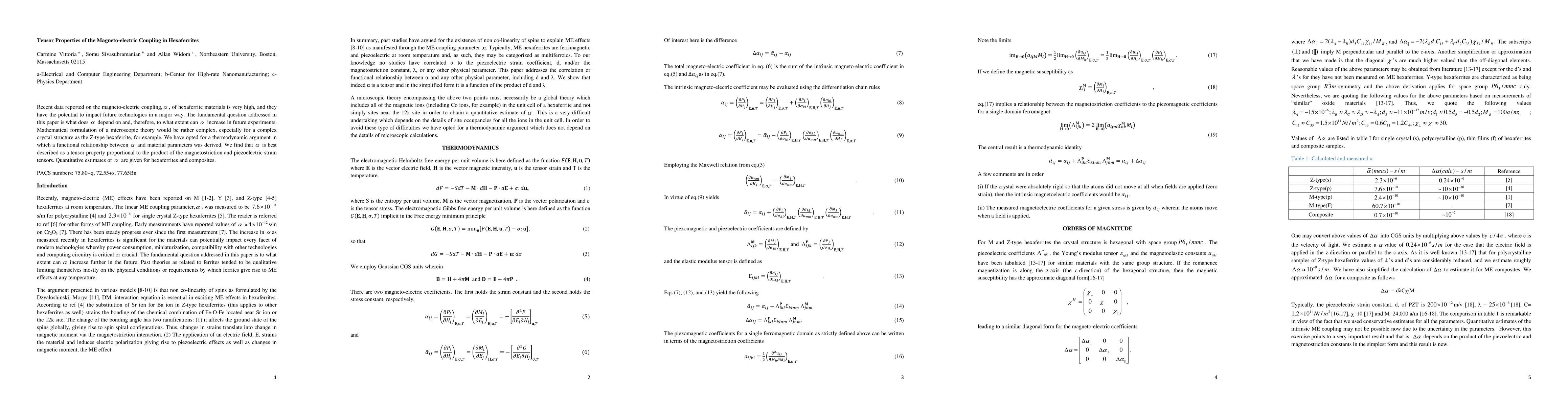 Recent data reported on the magneto-electric coupling,{\alpha}, of hexaferrite materials is very high, and they have the potential to impact future technologies in a major way. The fundamental question addressed in this paper is what does {\alpha} depend on and, therefore, to what extent can {\alpha} increase in future experiments. Mathematical formulation of a microscopic theory would be rather complex, especially for a complex crystal structure as the Z-type hexaferrite, for example. We have opted for a thermodynamic argument in which a functional relationship between {\alpha} and material parameters was derived. We find that {\alpha} is best described as a tensor property proportional to the product of the magnetostriction and piezoelectric strain tensors. Quantitative estimates of {\alpha} are given for hexaferrites and composites.
