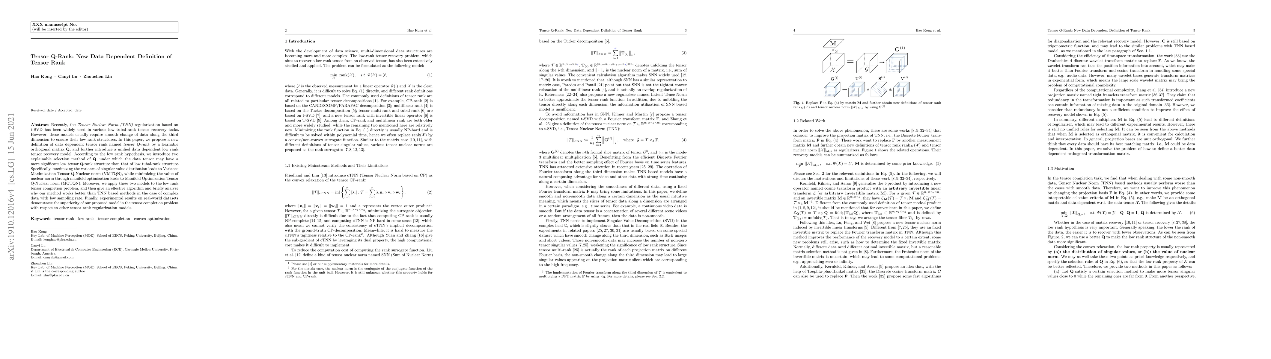 This paper introduces a new data-dependent tensor rank definition called tensor Q-rank, utilizing a learnable orthogonal matrix $\mathbf{Q}$, and proposes a unified low rank tensor recovery model. It presents two methods for selecting $\mathbf{Q}$ and demonstrates superior performance over Tensor Nuclear Norm based methods in tensor completion tasks, especially for complex data with low sampling rates.