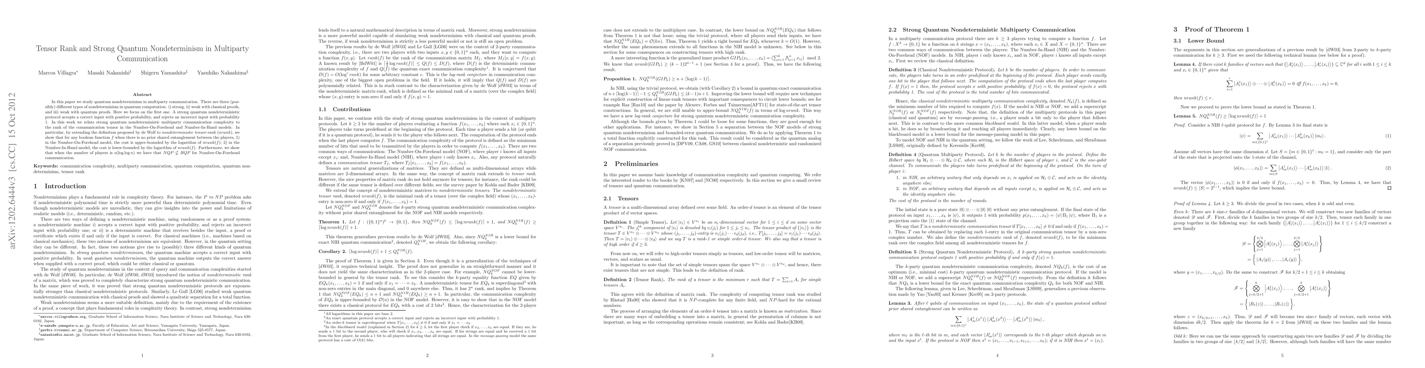 This paper explores the relationship between strong quantum nondeterminism in multiparty communication and tensor rank, showing that the communication cost in the Number-On-Forehead and Number-In-Hand models is bounded by the logarithm of the nondeterministic tensor-rank. It also establishes that without prior shared entanglement, $NQP\nsubseteq BQP$ for Number-On-Forehead communication when the number of players is sublogarithmic.