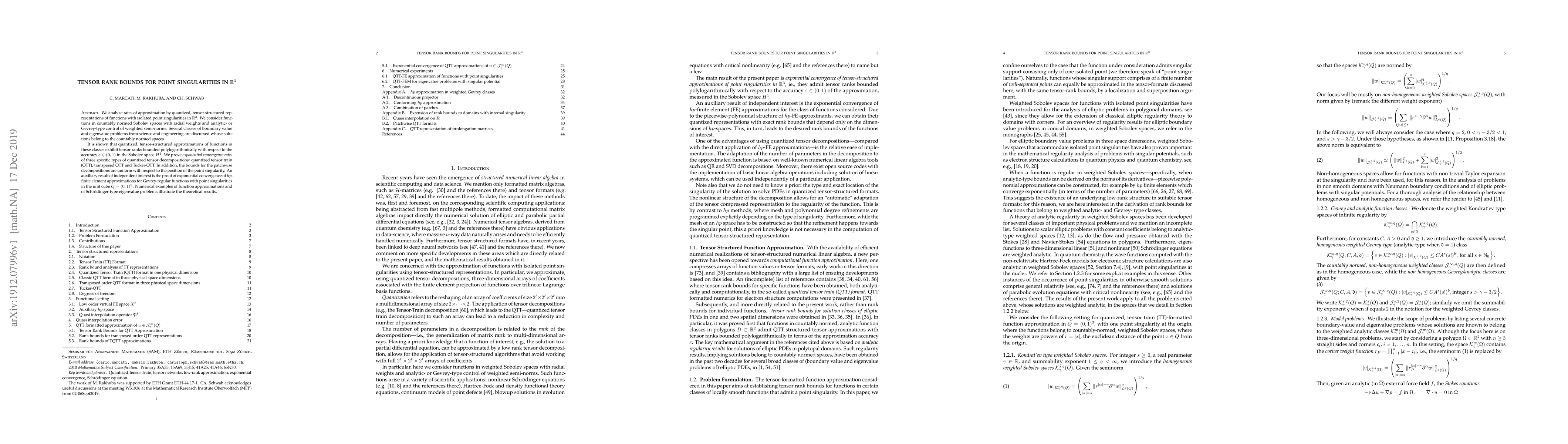 We analyze rates of approximation by quantized, tensor-structured representations of functions with isolated point singularities in ${\mathbb R}^3$. We consider functions in countably normed Sobolev spaces with radial weights and analytic- or Gevrey-type control of weighted semi-norms. Several classes of boundary value and eigenvalue problems from science and engineering are discussed whose solutions belong to the countably normed spaces. It is shown that quantized, tensor-structured approximations of functions in these classes exhibit tensor ranks bounded polylogarithmically with respect to the accuracy $\epsilon\in(0,1)$ in the Sobolev space $H^1$. We prove exponential convergence rates of three specific types of quantized tensor decompositions: quantized tensor train (QTT), transposed QTT and Tucker-QTT. In addition, the bounds for the patchwise decompositions are uniform with respect to the position of the point singularity. An auxiliary result of independent interest is the proof of exponential convergence of $hp$-finite element approximations for Gevrey-regular functions with point singularities in the unit cube $Q=(0,1)^3$. Numerical examples of function approximations and of Schr\"odinger-type eigenvalue problems illustrate the theoretical results.
