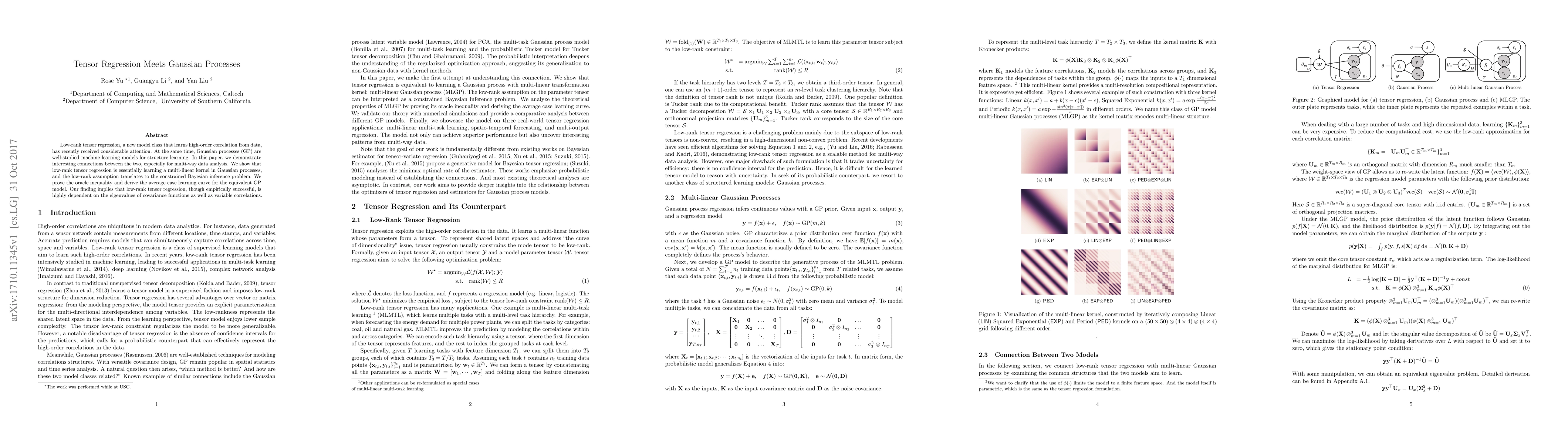 This paper explores the connections between low-rank tensor regression and Gaussian processes, showing that the former learns a multi-linear kernel in the latter. It demonstrates that the low-rank assumption in tensor regression corresponds to a constrained Bayesian inference problem in Gaussian processes, and provides theoretical guarantees for the learning curve.