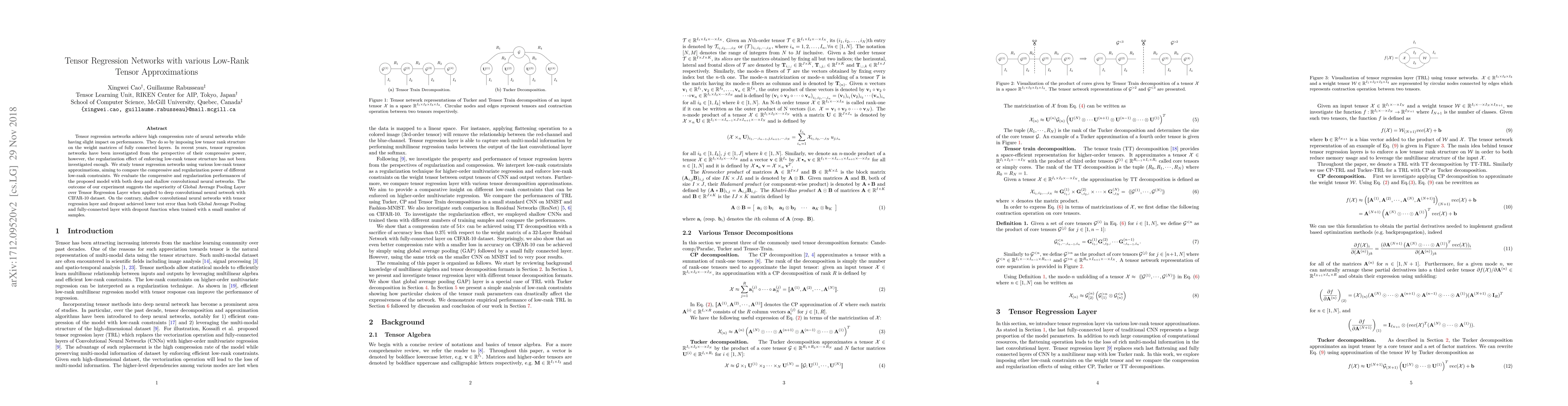 This paper investigates tensor regression networks that use low-rank tensor approximations to compress neural networks while maintaining performance. The study compares the compression and regularization effects of different low-rank constraints across deep and shallow convolutional neural networks, finding that Global Average Pooling Layer is superior for deep networks on CIFAR-10, whereas shallow networks benefit more from a tensor regression layer with dropout.