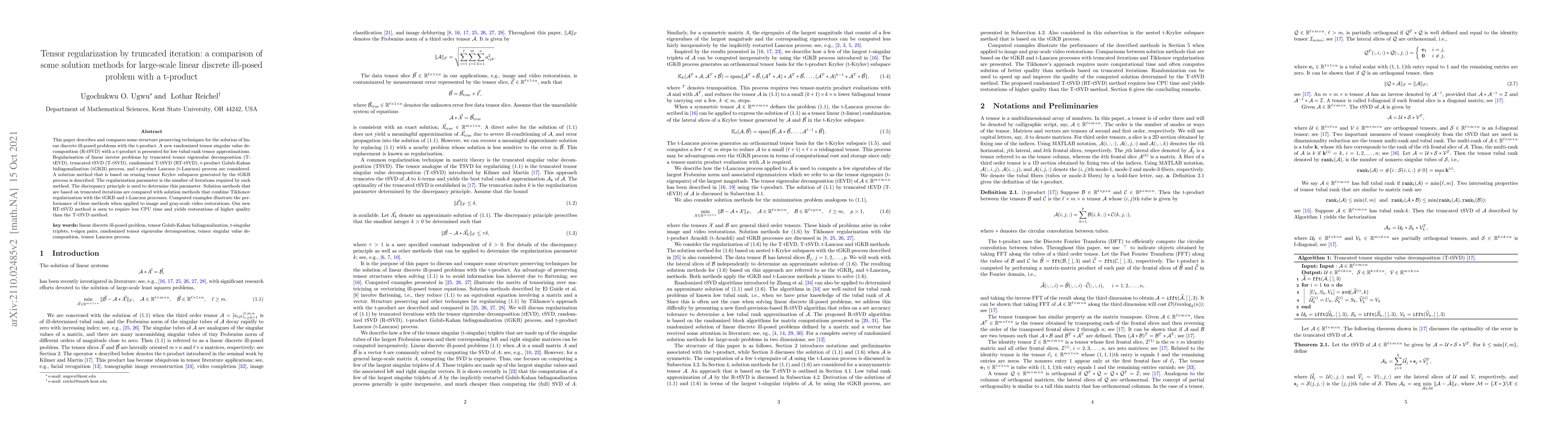This paper describes and compares some structure preserving techniques for the solution of linear discrete ill-posed problems with the t-product. A new randomized tensor singular value decomposition (R-tSVD) with a t-product is presented for low tubal rank tensor approximations. Regularization of linear inverse problems by truncated tensor eigenvalue decomposition (T-tEVD), truncated tSVD (T-tSVD), randomized T-tSVD (RT-tSVD), t-product Golub-Kahan bidiagonalization (tGKB) process, and t-product Lanczos (t-Lanczos) process are considered. A solution method that is based on reusing tensor Krylov subspaces generated by the tGKB process is described. The regularization parameter is the number of iterations required by each method. The discrepancy principle is used to determine this parameter. Solution methods that are based on truncated iterations are compared with solution methods that combine Tikhonov regularization with the tGKB and t-Lanczos processes. Computed examples illustrate the performance of these methods when applied to image and gray-scale video restorations. Our new RT-tSVD method is seen to require less CPU time and yields restorations of higher quality than the T-tSVD method.