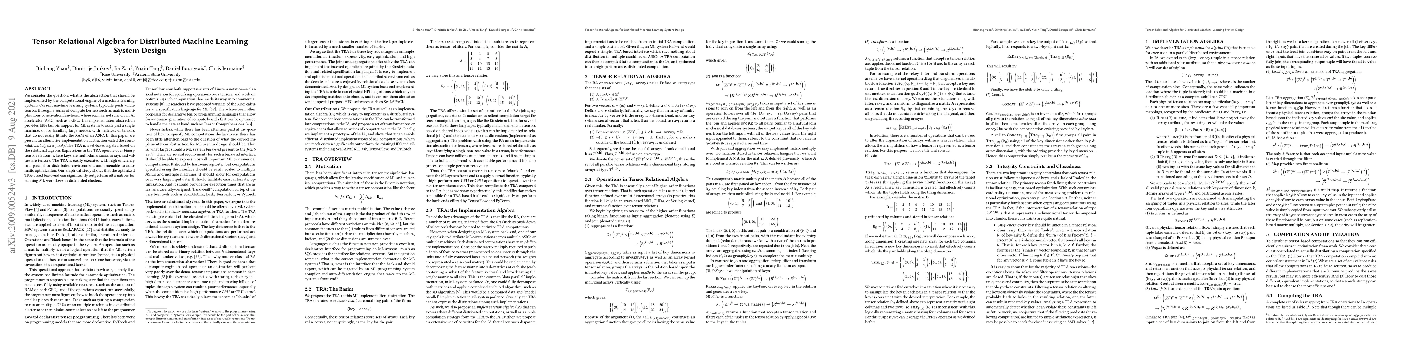 We consider the question: what is the abstraction that should be implemented by the computational engine of a machine learning system? Current machine learning systems typically push whole tensors through a series of compute kernels such as matrix multiplications or activation functions, where each kernel runs on an AI accelerator (ASIC) such as a GPU. This implementation abstraction provides little built-in support for ML systems to scale past a single machine, or for handling large models with matrices or tensors that do not easily fit into the RAM of an ASIC. In this paper, we present an alternative implementation abstraction called the tensor relational algebra (TRA). The TRA is a set-based algebra based on the relational algebra. Expressions in the TRA operate over binary tensor relations, where keys are multi-dimensional arrays and values are tensors. The TRA is easily executed with high efficiency in a parallel or distributed environment, and amenable to automatic optimization. Our empirical study shows that the optimized TRA-based back-end can significantly outperform alternatives for running ML workflows in distributed clusters.